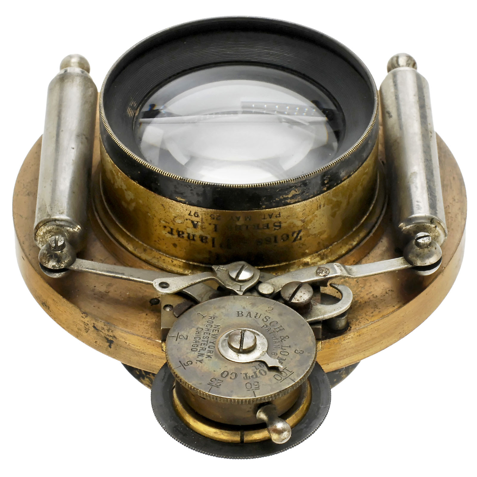 Zeiss Planar, built-in Bausch & Lomb shutter. Engraving: "Zeiss-Planar Series I.A. Pat. May 25.97". Focal length f=184 mm, serial-no. 21797, shutter 1–1/100 sec. – Very early "Planar" lens and a wonderful illustrative model!