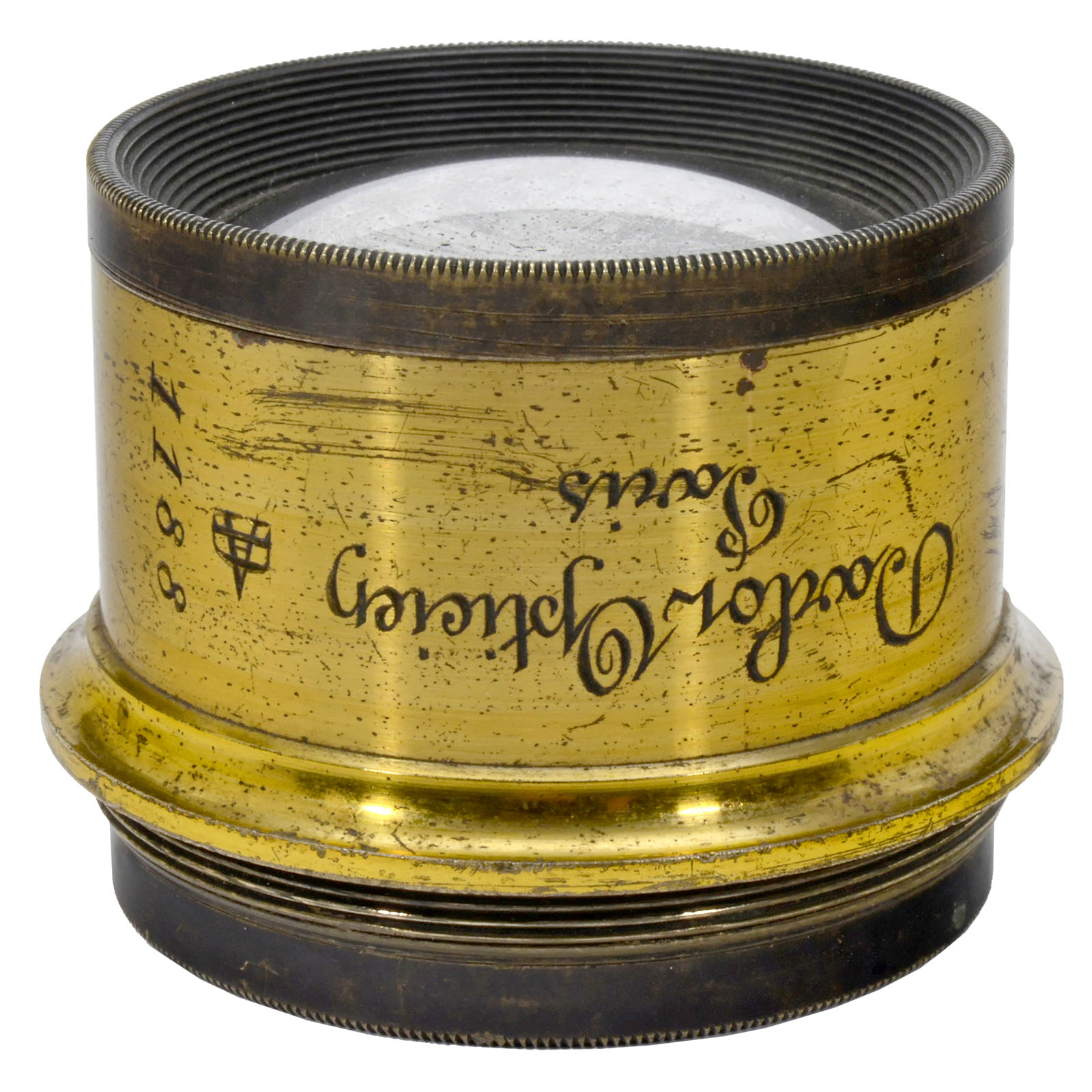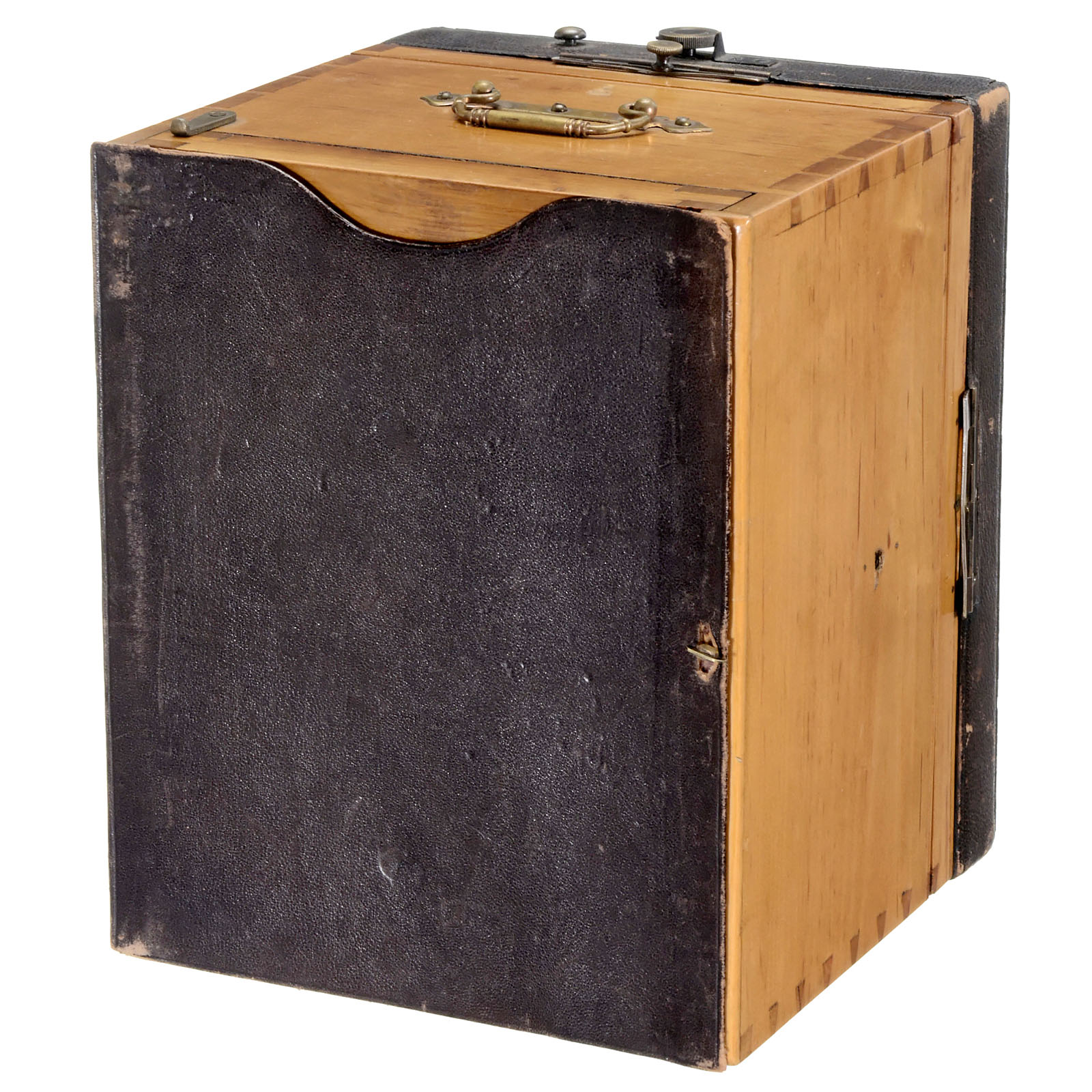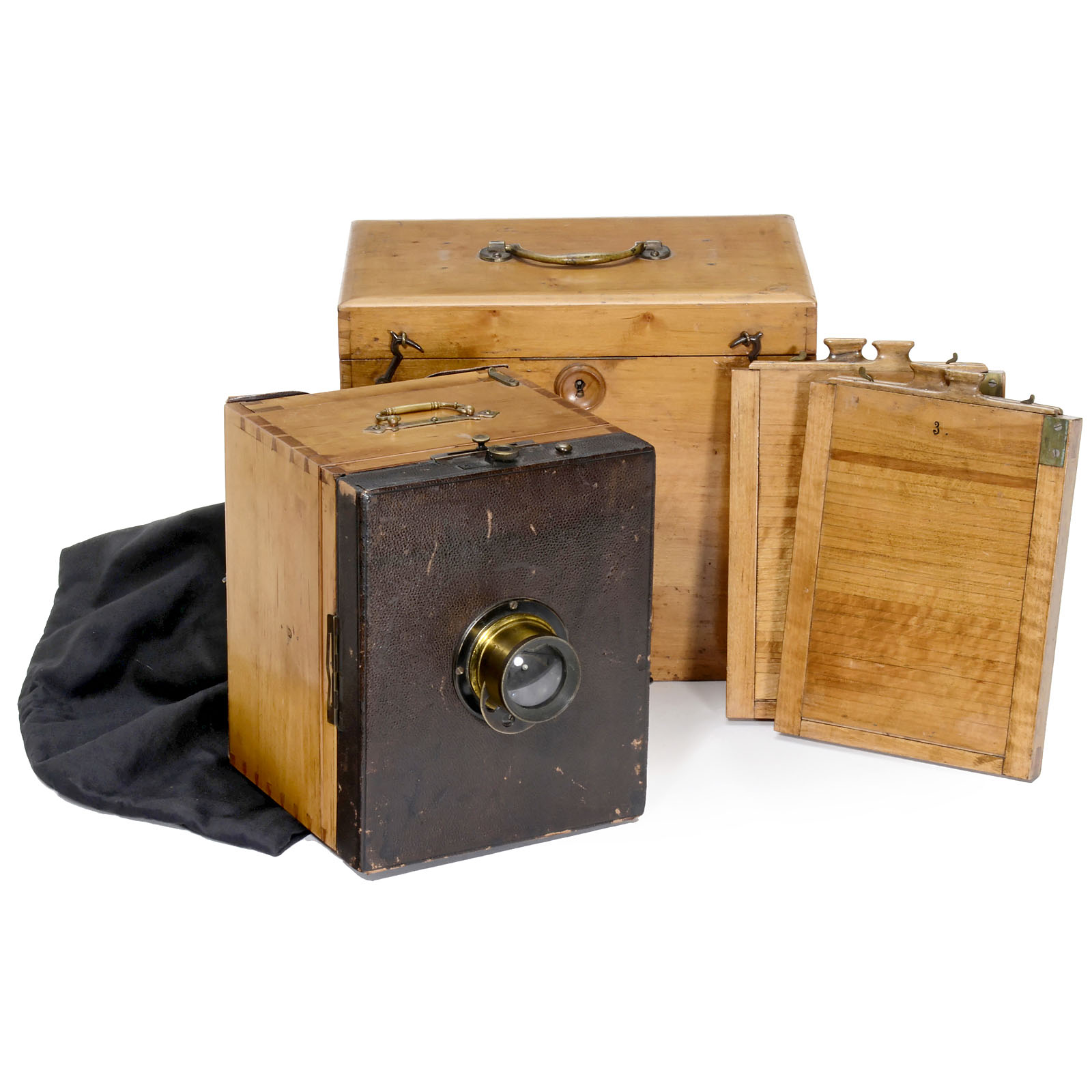 Unmarked, presumably French. Lemon tree wood, the front plate moves horizontally and vertically, built-in guillotine shutter with variable speeds (working), black leather front and back, plate size 13 x 17 cm. – Lens: Darlot Opticien Paris, universal lens with rotating stop, approx. 12 cm focal length, serial no. 1188. Camera with focusing screen back, 2 wooden double-cassettes, cloth and wooden case. – Not mentioned in any literature!