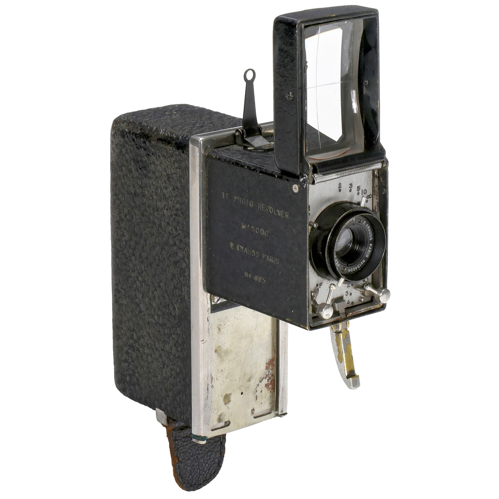 E. Krauss, Paris. Gun camera for magazines of 48 plates (size 22 x 36 mm) or special rollfilm back for 25, 50 or 100 prints (20 x 30 mm), Krauss-Tessar 4,5/40 mm lens, 3-speed shutter (needs attention), serial number of the camera 825. Very attractive exhibition piece and desirable collector's item.