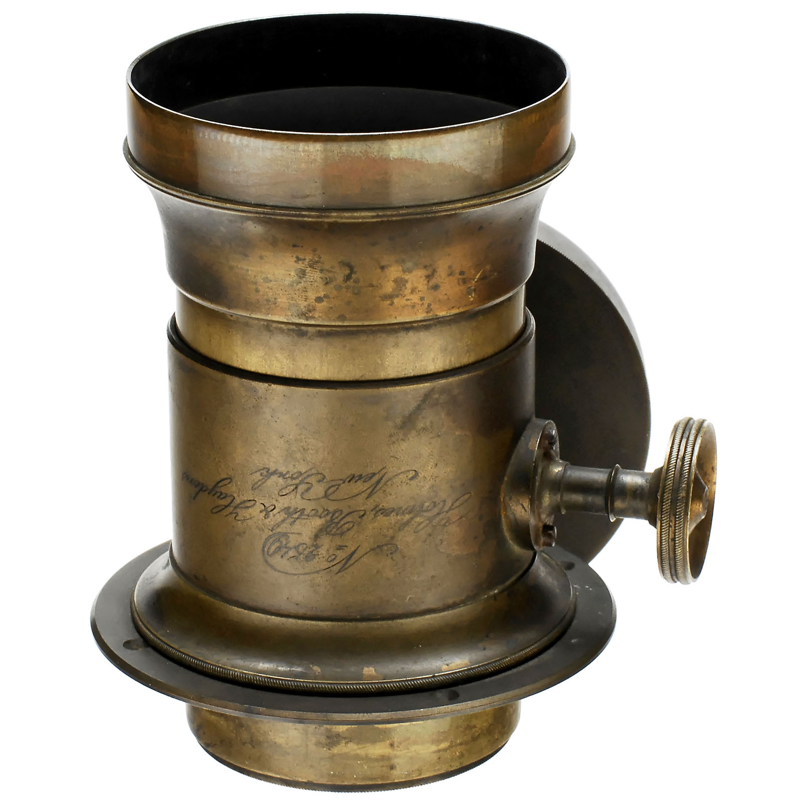 New York. No. 2549, Petzval-type, with typical rack-and-pinion focusing, focal length of approx. 8 in. (20 cm), diameter of front element approx. 2 3/8 in. (6 cm), flange 3 7/8 in. (10 cm) and height 5 ½ in. (14 cm.) – The firm of Holmes, Booth & Haydens was one of the leading pioneers in the field of brass and copper work. In addition to photographic items such as Daguerreotypes and illuminants for magic lanterns, the firm also produced objects for domestic life, including cutlery and an assortment of lamps. – A very rare lens by an early American manufacturer – an important document in the development of photography.