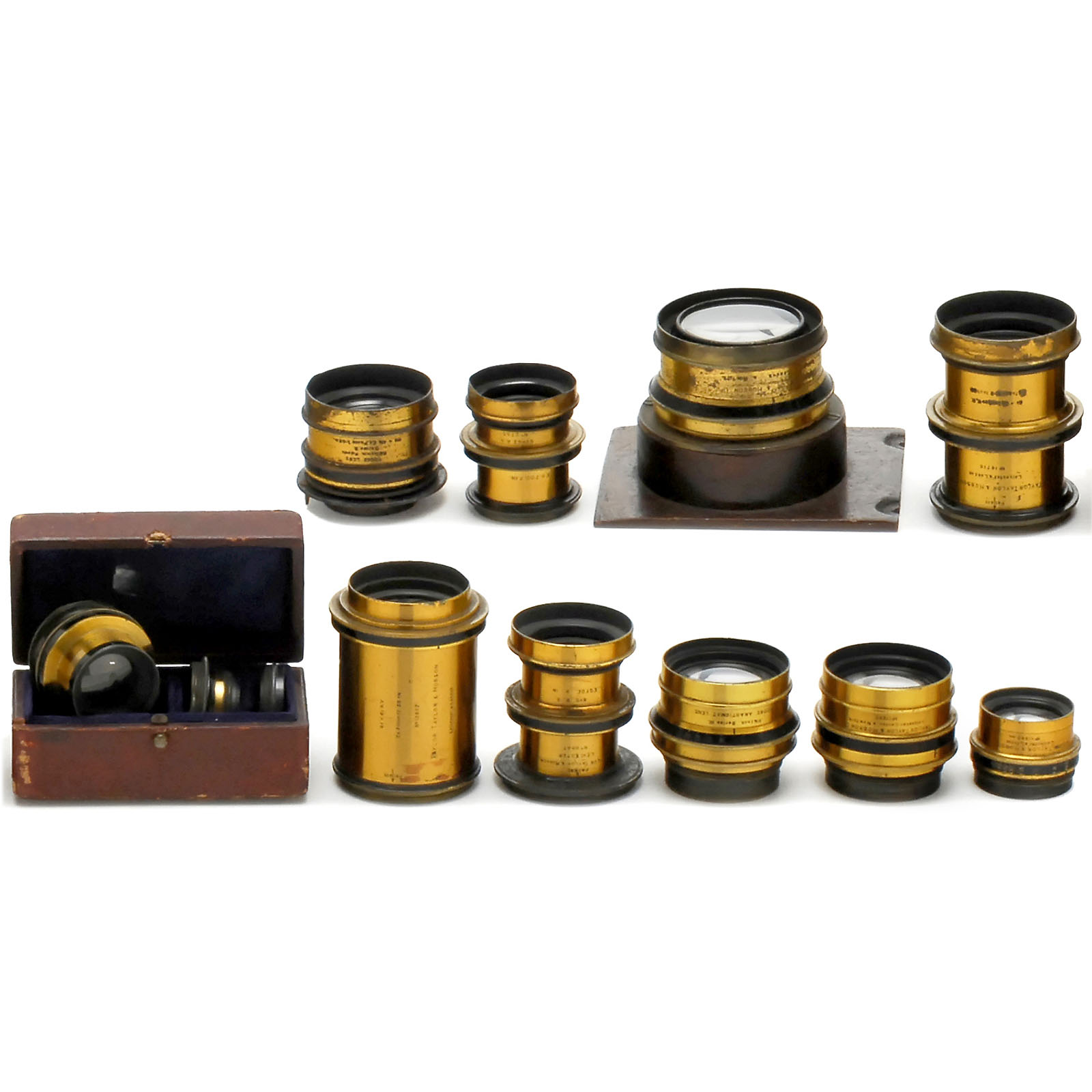Taylor Taylor & Hobson. 1) Convertible lens "6 ½ x 4 ¾ R.R. EQ Focus 7.35 IN", in box. – 2) Cooke lens "Taylor's Patents Series III 5 x 4 Inches EQ focus 6 inches". – 3) Cooke Anastigmat lens 9 ½ inch Series III". – 4) Brass lens "6 ½ x 4 ¾ R.R. EQ. Foc. 7 in.". – 5) Cooke lens "Series III 6 ½ x 4 ¾ EQ Focus 7.45 in.". – 6) Cooke lens "H.D. Taylor's Patents Series V 8 ½ x 6 ½ inches EQ focus II.I inches." – 7) Brass lens "8 x 5 R.R. EQ. Foc. 9 in." – 8) Brass lens "8 ½ x 6 ½ R.V. EQ Focus 12.88 in." – 9) Brass lens "8 ½ x 6 ½ R.R. EQ focus II.2 inches." – And: 10) Cooke lens "Series II 6 ½ x 4 ½ inches EQ focus 8.2 inches." – Mixed condition.