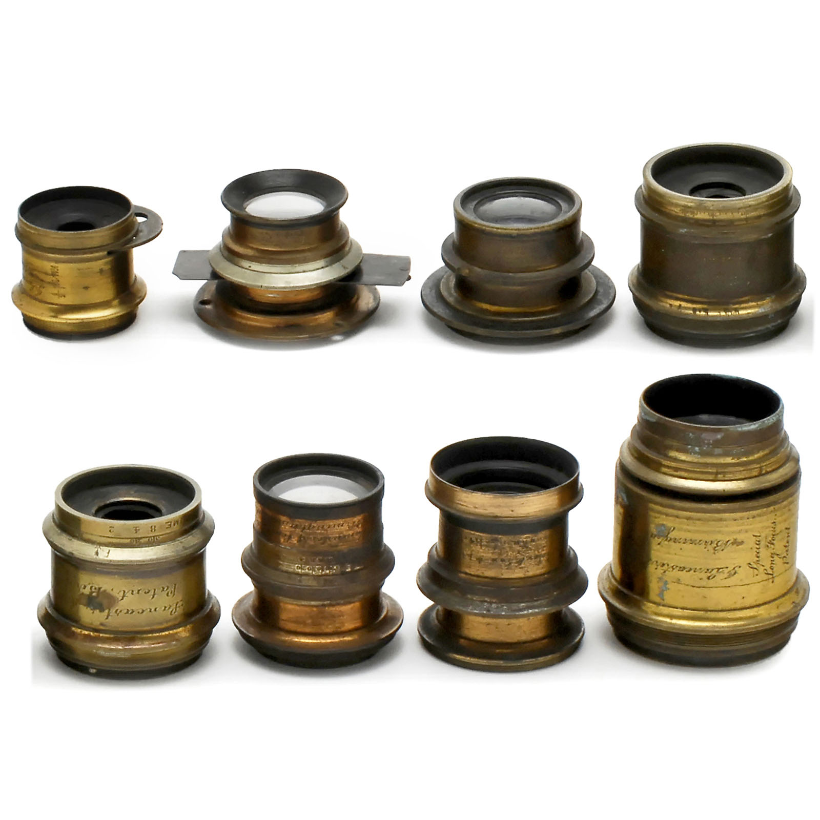 Lancaster & Son, Birmingham. 1) "Rectigraph 1 ½ pl. Patent", approx. 15 cm focal length, with slide shutter and iris stop, connecting ring, height 1,57 in. – 2) "1 ½ pl. WA", wide-angle lens with approx. 13 cm focal length, rotating stop, height 1,57 in. – 3) "F. Lancaster & Son's Patent", approx. 23 cm focal length, iris stop. – 4) "Lancaster's Patent", approx. 20 cm focal length, iris stop. – 5) "½ Patent Bertigraph", copper body, approx. 23 cm focal length, iris stop, height 2,36 in. – 6) "J. Lancaster & Son Ltd. Anastigmat Rectigraph Series III No. 3", iris stop, height 1,57 in. – 7) "½ pl. Patent Rectigraph", approx. 40 cm focal length, iris stop, height 2,36 in. – And: 8) "Special Long Focus Patent", focal length not visible, maybe lens element missing.
