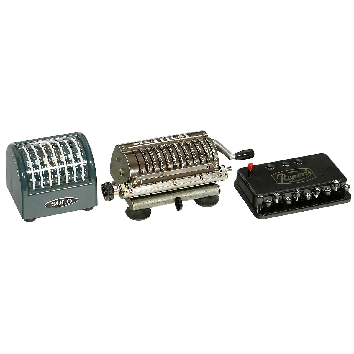 1) "Reports", c. 1955. Adix' successor in bakelite. (2-/3-) – And: 2) "MultiCal", c. 1958. French, by Eclair-Bureau, Paris. (3-/3-) – And: 3) "Solo", c. 1980. Japanese adding machine. (2/2)