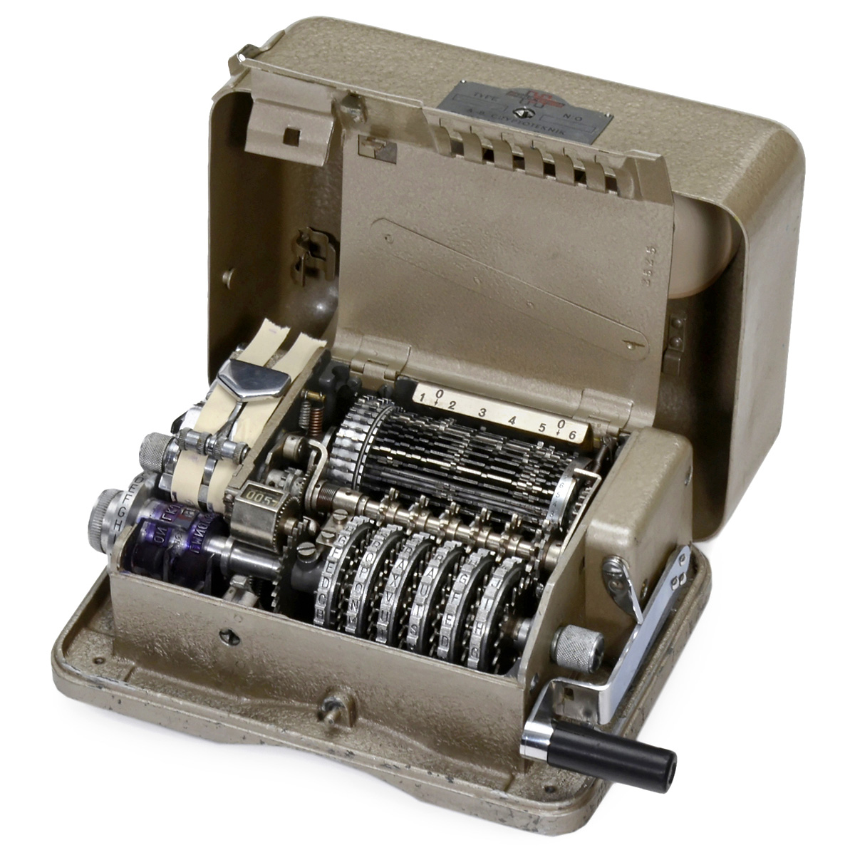 Hagelin Cryptographer, manufactured by "A.B. Cryptoteknik, Stockholm". No. 2525, mechanically operated, with 6 coding wheels, 2 paper reels and printer, metal case with grained finish, with two operator's keys and two officer's keys.