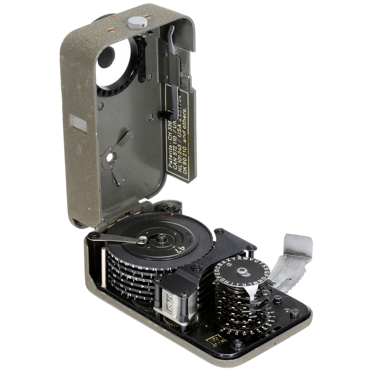 Swiss army pocket cryptographer, manufactured by "Crypto AG in Zug", serial no. 3000468, mechanically operated, with 6 coding wheels (29, 31, 37, 41, 43 and 47), metal case, size only 5 ½ x 3 1/8 x 1 ¾ in., working. The last constructed mechanically operated cipher machine by Boris Hagelin.