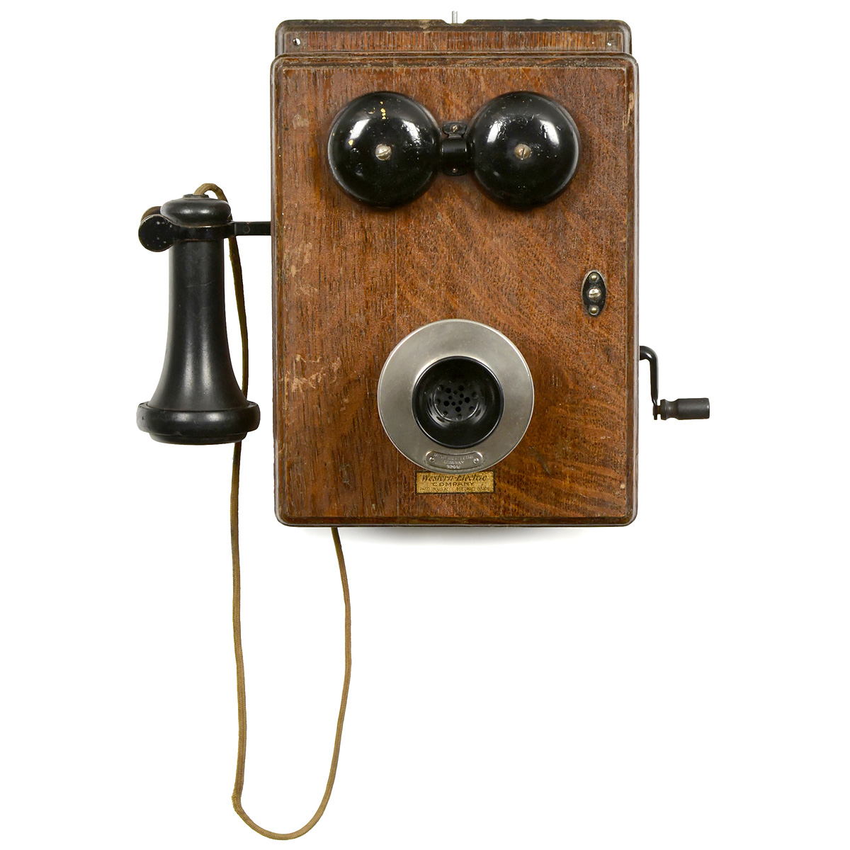 Wooden case, crank-driven inductor, moveable microphone, Bell-type receiver.