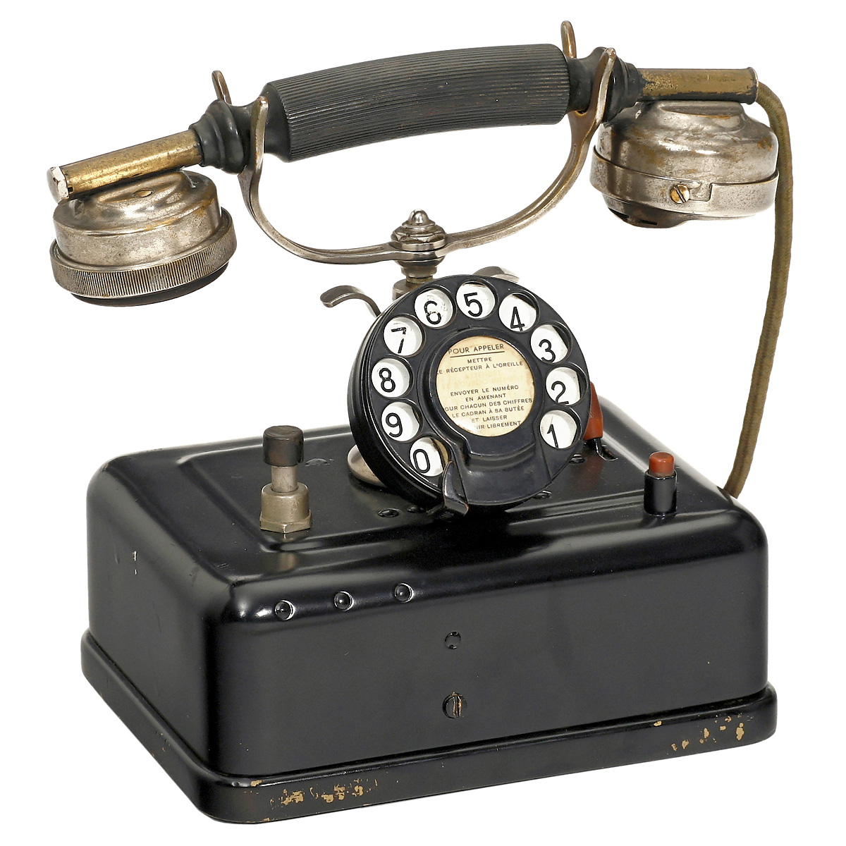 1) Table phone with dial, metal case, c. 1928. – And: 2) Bell Telephone Company, Belgium. Wall phone, metal case, c. 1950.