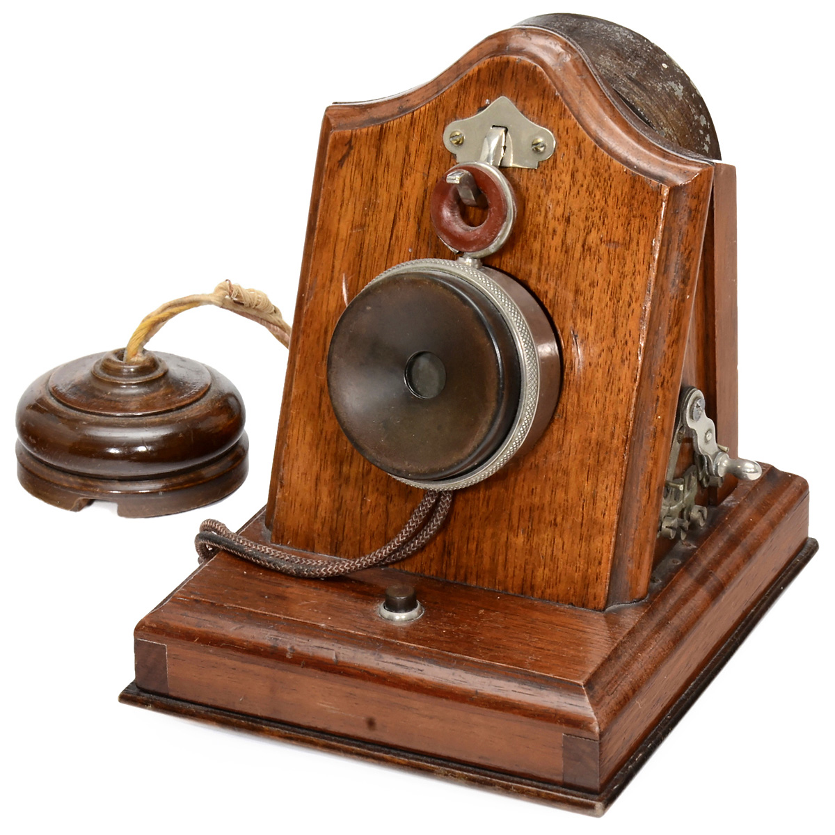 Probably by Mix & Genest, walnut case, carbon granular transmitter, alarm bell on the rear side, round receiver.