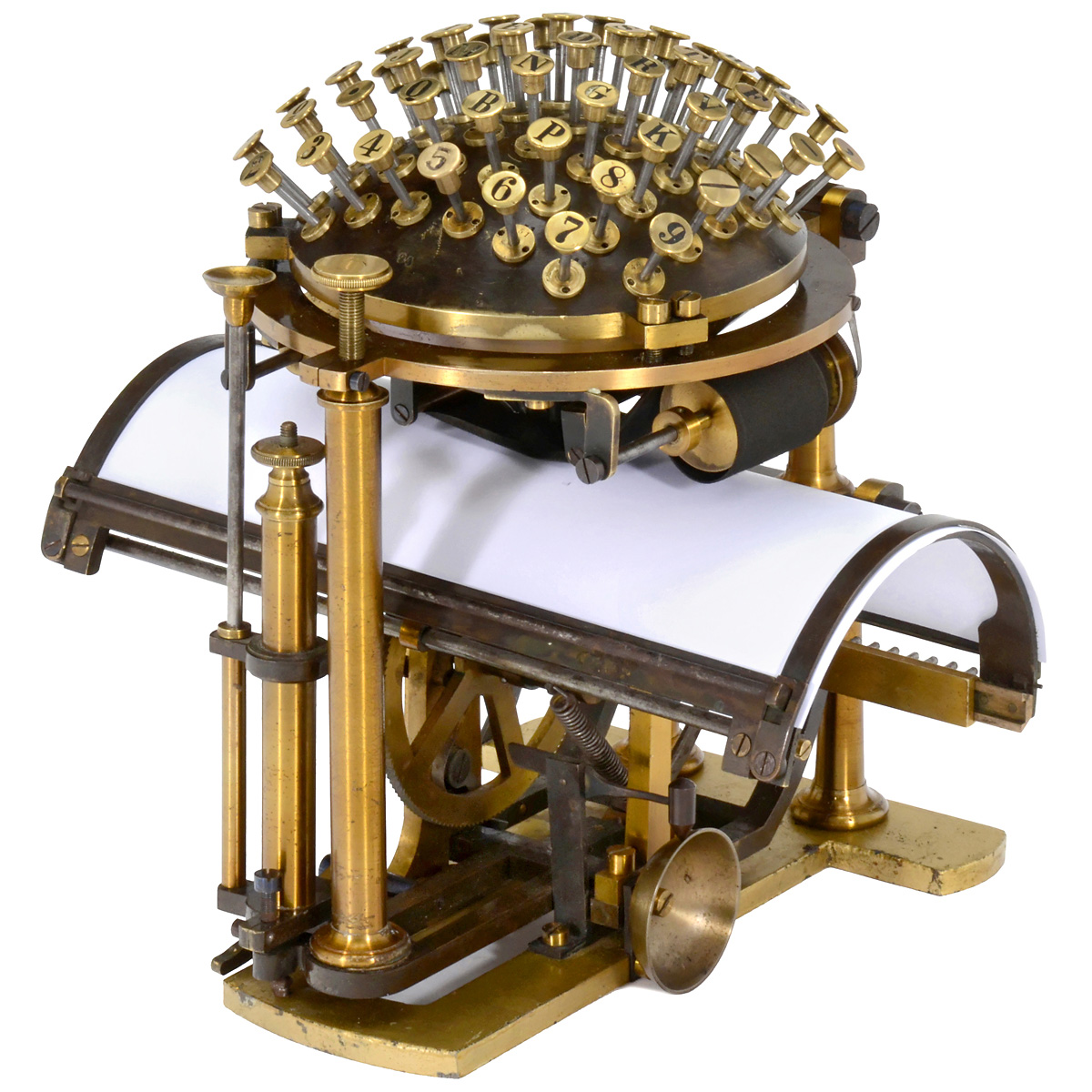 This fascinating machine, the 1st typewriter in the world produced in series, is an historical and technical document. Pastor Rasmus Hans Johan Malling-Hansen – director of Denmark's deaf-and-dumb institute in Copenhagen – invented this wonderful brass precision machine: each of the 54 spring-driven hemispherical typebars slides in a different angle to a tiny central printing pole, which means that every single letter has to be aligned differently. All these letters had to be engraved onto the end of the tiny typebars at that time by professional copperplate engravers of type foundries for the printing process. This technique is no longer possible as (decades ago) all the world's type foundring companies went out of business when typesetting changed to composing (electronics). Technically this 1st typewriter in the world from 1867 already displayed all the significant refinements of typewriters that were introduced 40–50 years later: automatic carriage return and line spacing, space bar, index for paragraphs or indented lines, bell to signal the end of the line, typing copies by carbon paper, ribbon reverse and – last but not least – visible writing by raising the typing mechanism. – These were, and still are, sensational technical refinements which were unbeaten for the almost 40–50 following years. – Not only does the detailed technical precision work of this Malling-Hansen writing ball fascinate us, its elegant brass form is also an iconic design in its own right. – From a total of (presumably) 180 machines ever made there are only 5 models left today in private hands (and 2 of them with Moon's blinds' alphabet on the keytops and not useable for ordinary characters' writing). All the others (about 30) are already included in museum collections worldwide, and therefore beyond the reach of the market and the private collector. – This model is in excellent restored original condition, only key top "5" is replaced and types are worn. – The serial number is 94! – The writing ball by Pastor Malling-Hansen is the world's most expensive historical typewriter with auction records of up to € 131.000,- (US$ 123,000)! – No doubt that this very 1st typewriter in the world is technically as well as optically the giant showpiece of any advanced collection and exhibition worldwide!