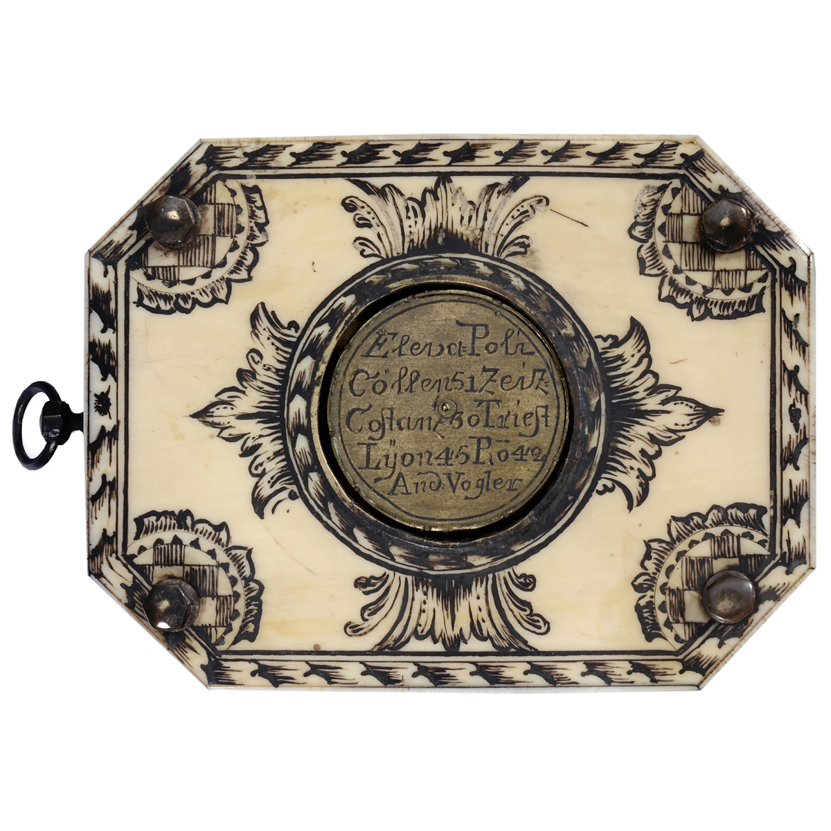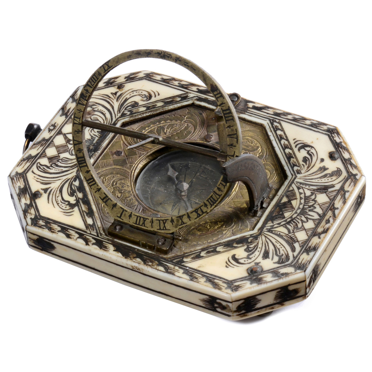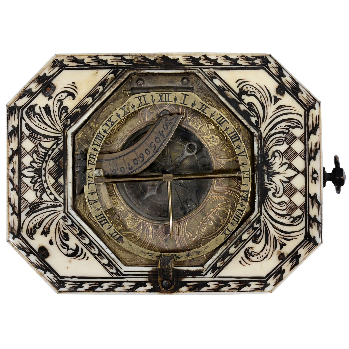 In engraved bone outer case, Augsburg pocket sundial, octagonal brass ground plate, inset compass, hour ring with spring loaded gnomon, reverse with engraved latitude of European cities and signature "And. Vogler", overall size 3 ½ x 2 ½ in.
