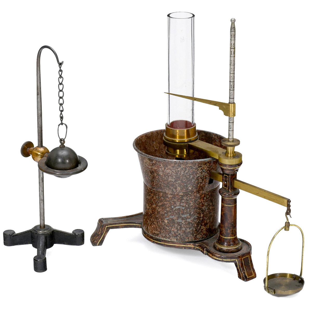 1) Pascal's apparatus, for showing that the pressure of liquids depends on their height, cast metal, brass, glass and tin, height 12 ½ in. – And: 2) Sphere with ring, after S'Gravesande, for showing the expansion of solids by heat, height 11 2/5 in.