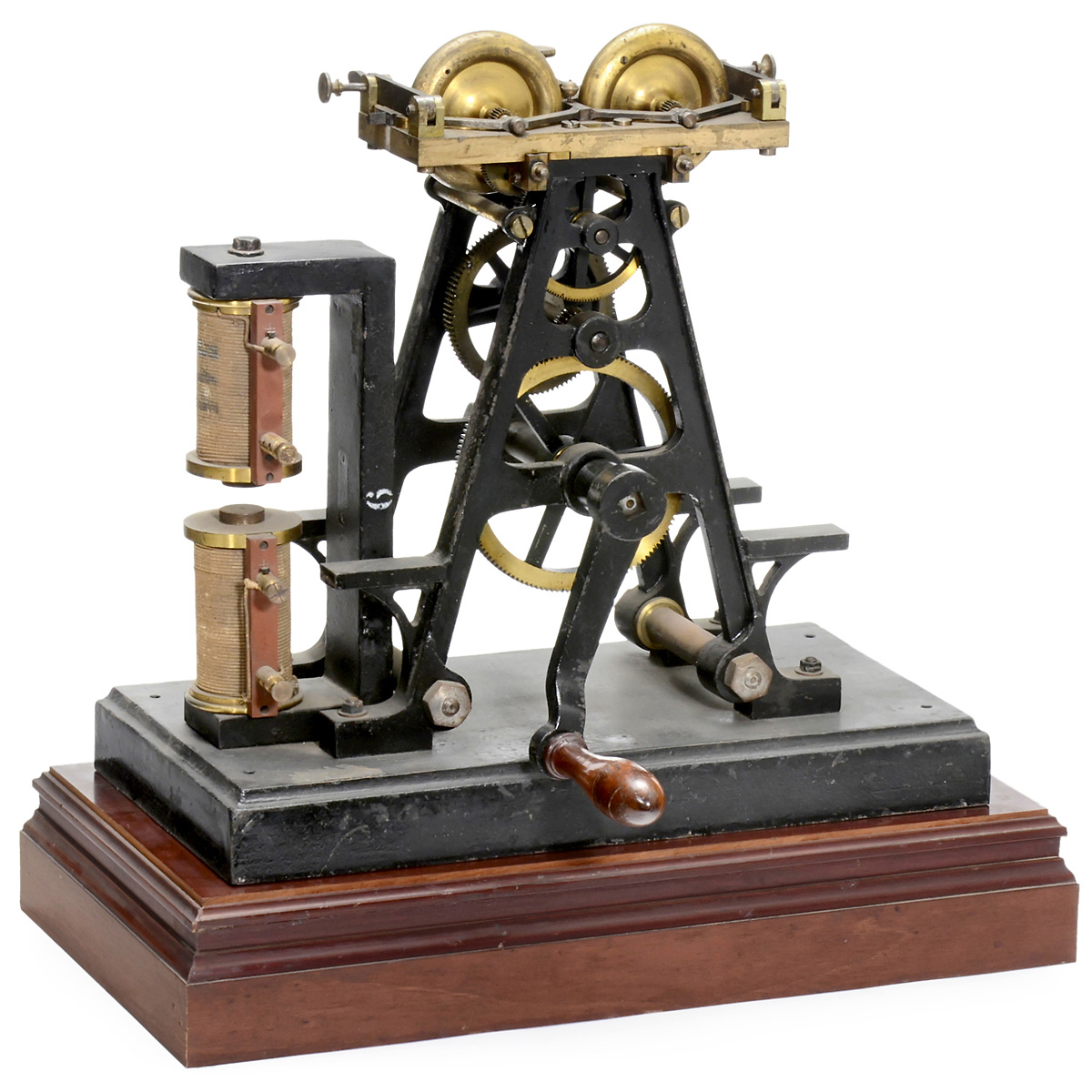 "E. Ducretet & Cie à Paris", brass and cast iron, handcrank-driven, powerful gearing, 2 gyroscope-type wheels, 2 lateral electric magnets, exact function unknown, overall size 17 ¾ x 9 ½ x 18 ½ in.