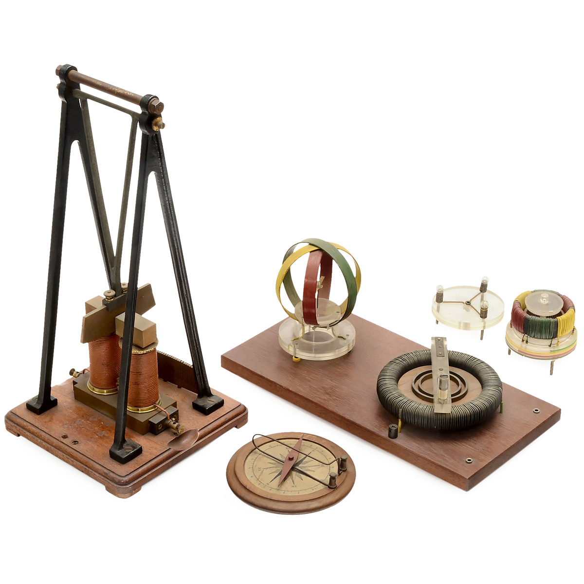 1) Waltenhofen's electromagnetic pendulum, used to demonstrate Lenz's law, on mahogany base, overall height 18 ¼ in. – 2) Magnetic compass, used to demonstrate the deflection of the needle by galvanic current, Ø 6 ¼ in. – And: 3) Device used to demonstrate the effect of different currents to magnets, c. 1950.