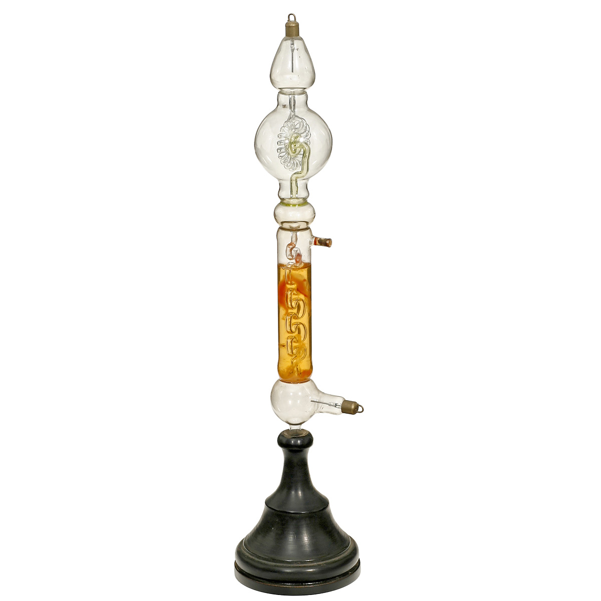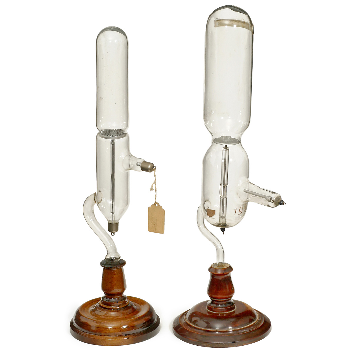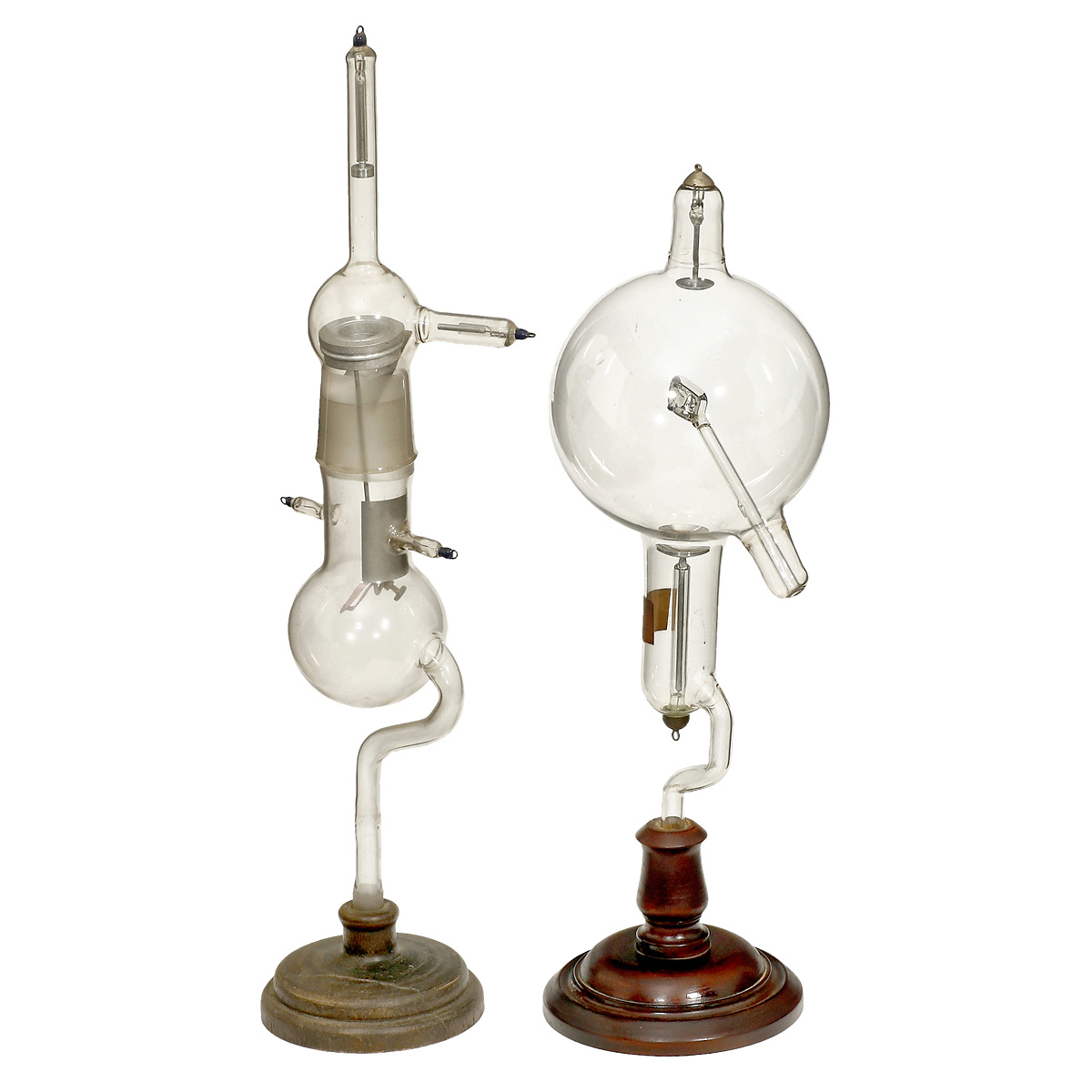 1) Geissler tube, 2-part, 1 part with fluorescent liquid, length 16 ½ in. – 2) 2 Goldstein tubes, 1 by Leybold, length each 14 ½ in. – 3) Crookes heat ray tube by Leybold, length 14 1/5 in. – And: 4) Tube with unknown function, detachable, length 17 ¾ in. – All tubes with stands.