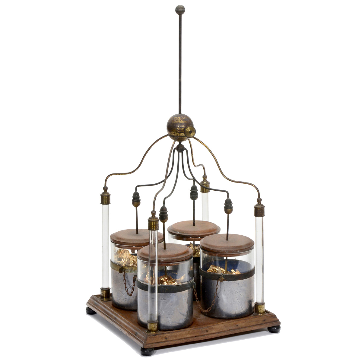 For charging with electrostatic induction machines, interconnected, with additional isolation glass rods, on walnut base, overall size 11 ¾ x 11 ¾ x 26 in.