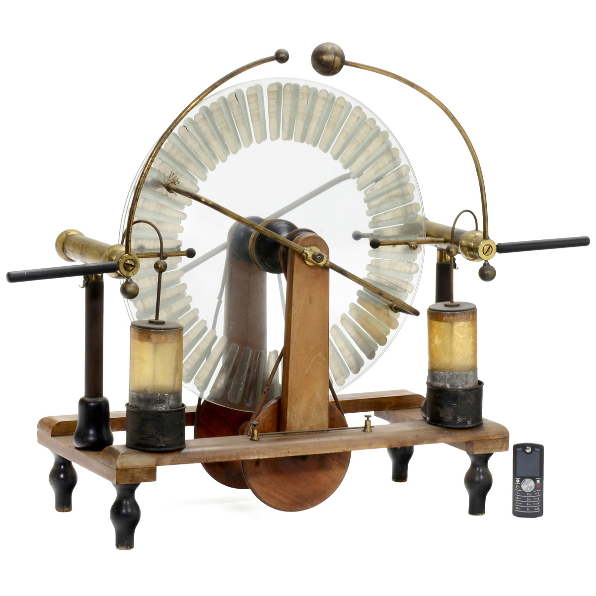 Laboratory and education model, disc diameter 19 1/3 in.! Handcrank-driven, complete with Leyden jars, conductors, belt and crank. Overall size: 36 x 17 x 26 1/3 in. – An early and impressive model in working condition!