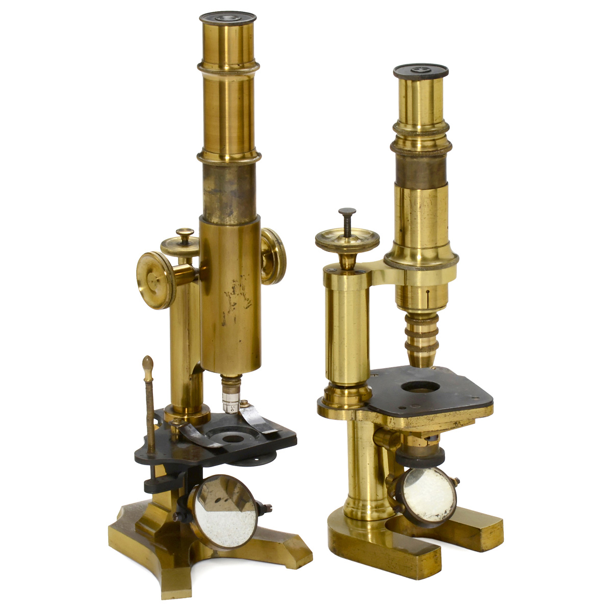 Unsigned, with original lacquer. 1) Berlin-type, double mirror, swiveling stage and upper section, double draw tube, screw fine adjustment, height 12 ¼ in., c. 1870. – And: 2) Probably France, double mirror, substage pinhole diaphragm, tilting stand, lever-controlled mechanical stage, fine and coarse adjustment, height 11 2/5 in., c. 1875, with fitted mahogany case.
