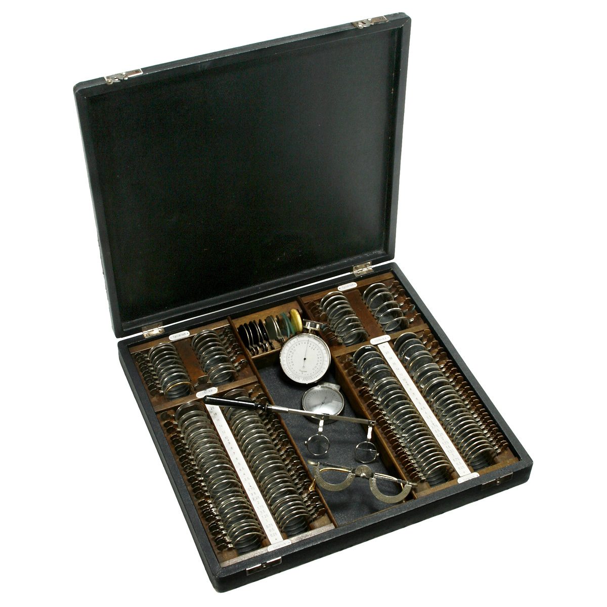 With 147 special lenses, trial frame, 9 other lenses, 1 diopter meter and other parts. In leather-covered wooden case.