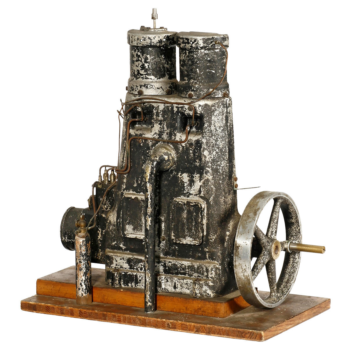 Paul Räth, Leipzig. Twin-cylinder gas engine, valve control with camshaft, 6 ¾ in. flywheel, hand-cranked, on wooden base with maker’s plate, overall height 17 ¾ in.