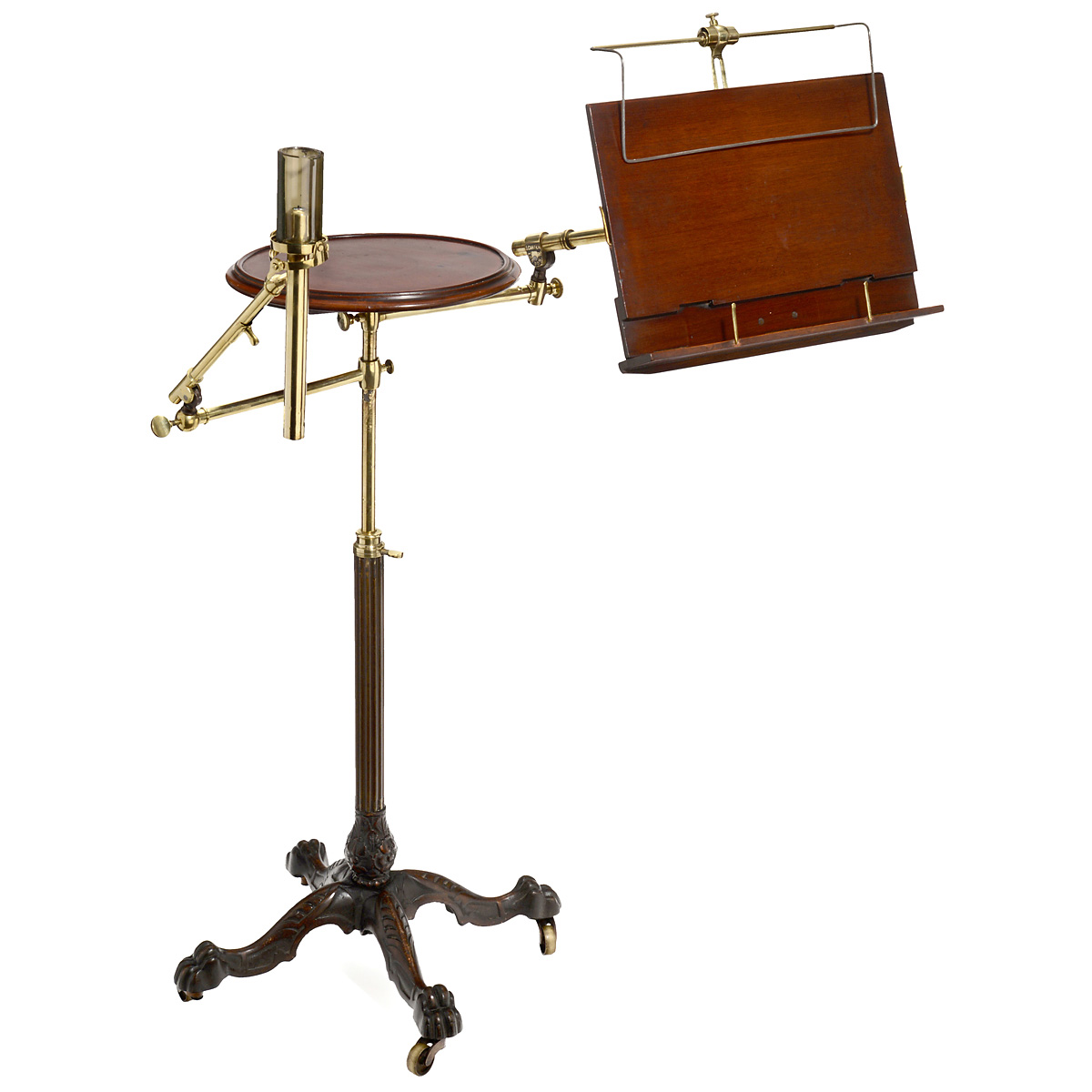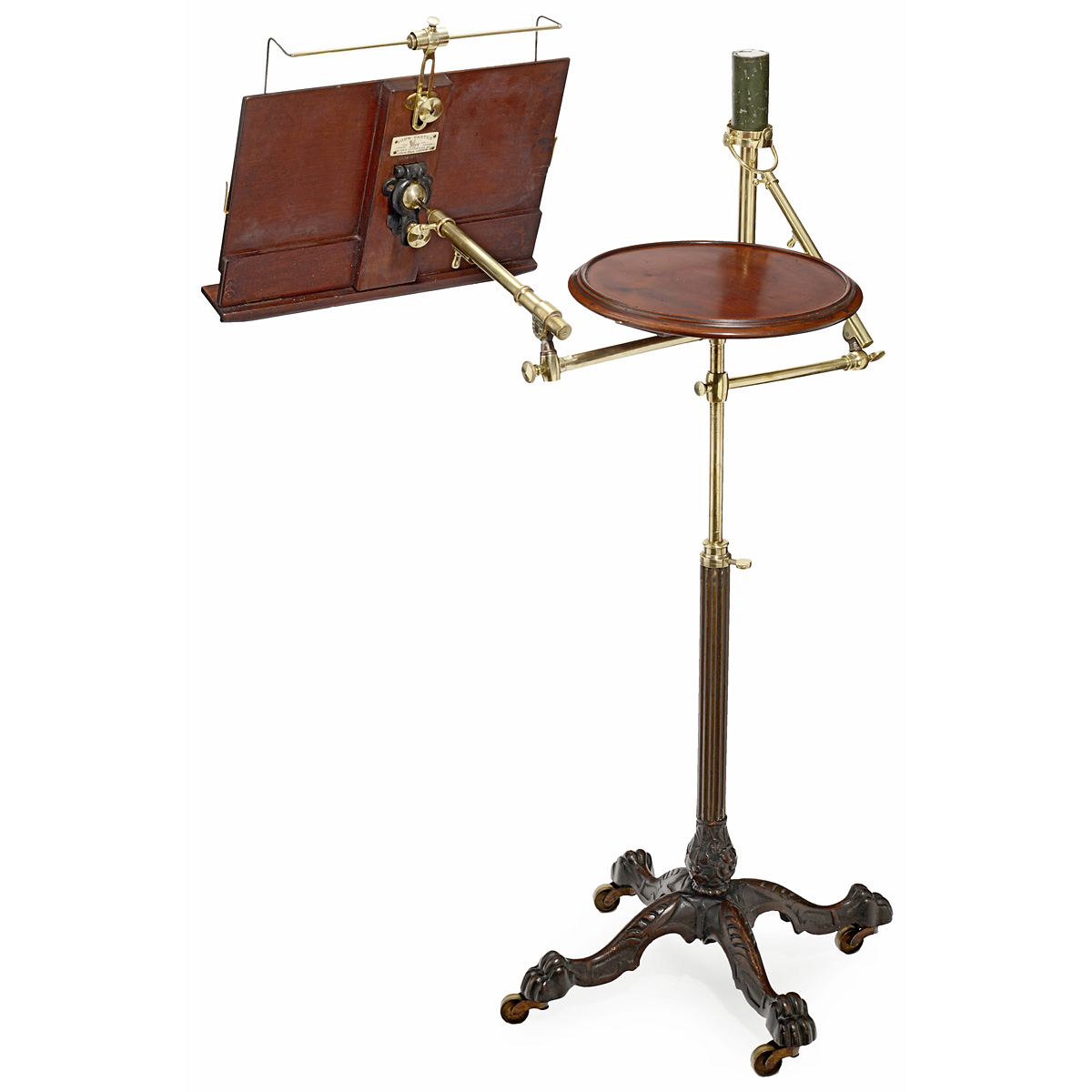 Fully-adjustable reading stand, brass and mahogany, heavy bronzed cast-iron base with paw feet on castors, ball-joint-mounted reading ledge and mounted candle holder, overall height 51 in. – Very decorative and functional.