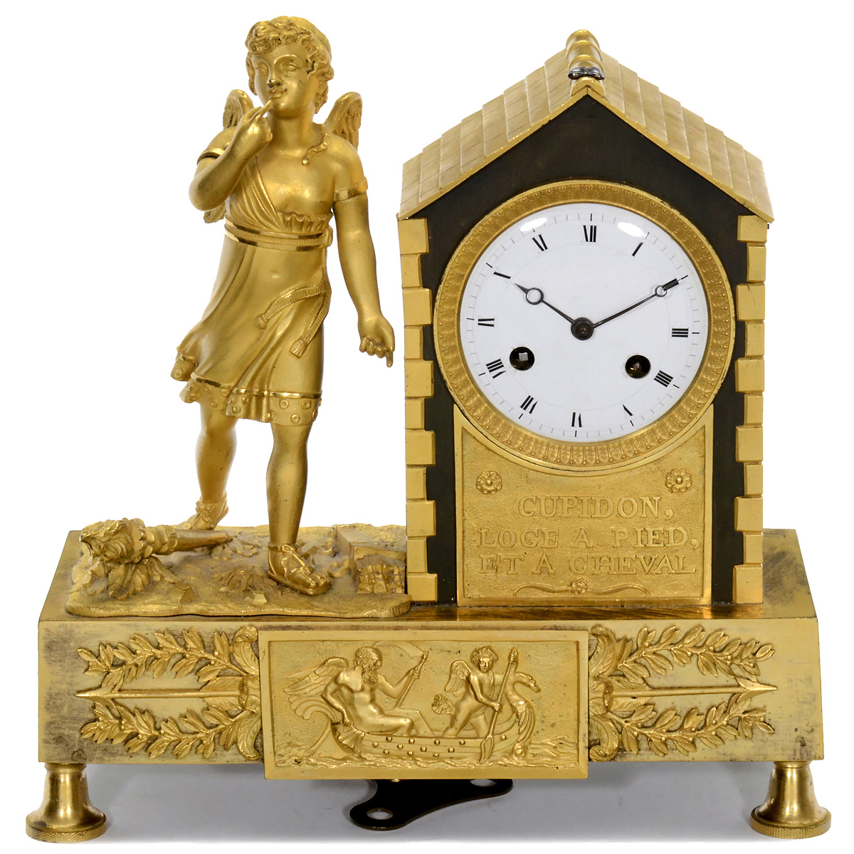 Gilt bronze, square base with laurel branches and Cupid and Chronos on the front, winged Cupid figure with torch and arrows on the base, house-shaped clock with inscription "Cupido, Loge à Pied, et à Cheval", small silvered butterfly on the roof, brass pendulum movement with string suspension, half-hour strike on bell. The clock runs a short time but stops, size 9 7/8 x 4 x 10 5/8 in.