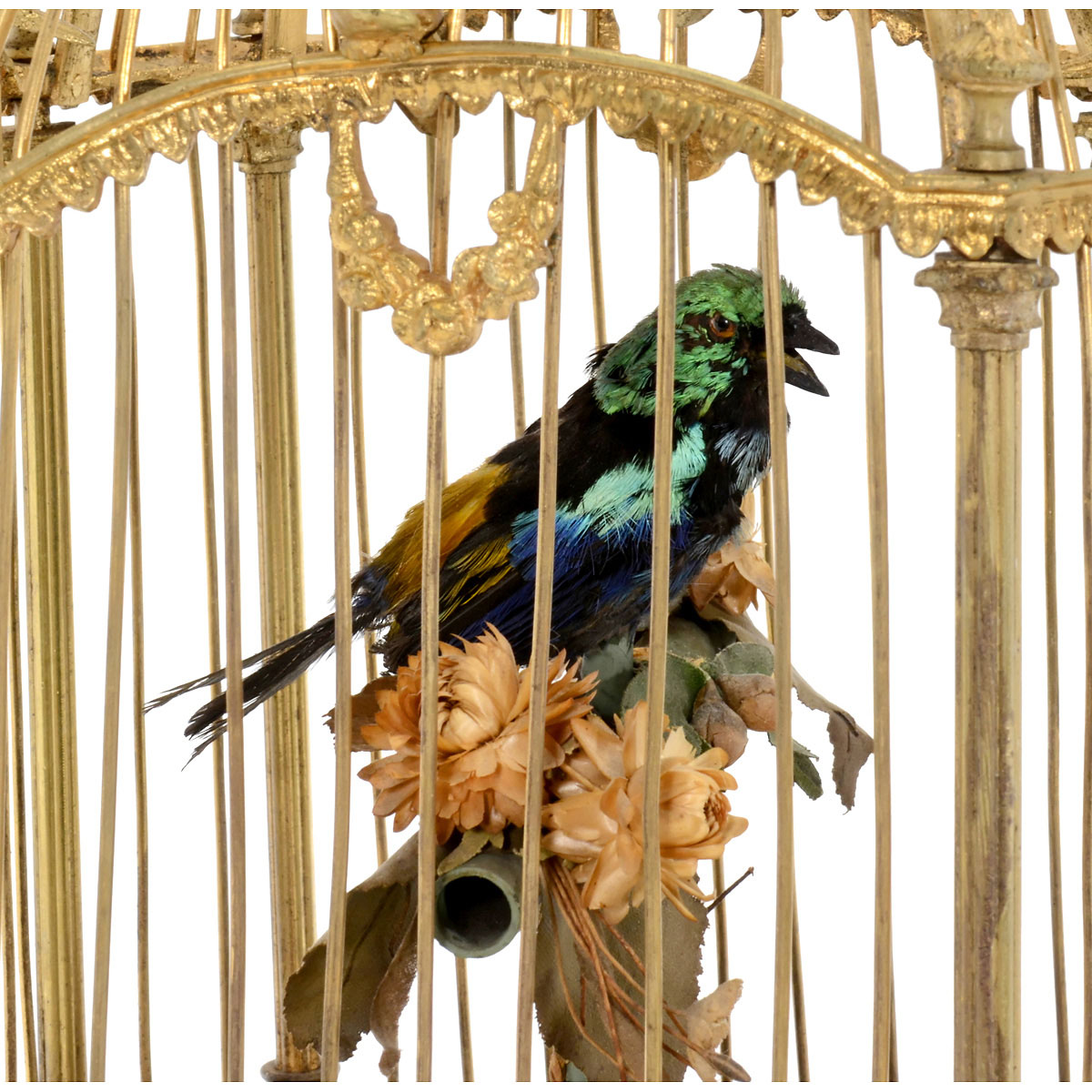 Bird with emerald-green and blue plumage, moving head, beak and tail, in domed cage decorated with figures of exotic birds, pendant garlands and flaming-urn finials supported by slender fluted columns, the ormolu base with canted corners, acanthus leaf frieze, floral relief and four inset Sèvres porcelain panels with scenes of courting couples in a bucolic landscape, with going-barrel movement, whistle, bellows, stop/start and volume control levers, ht. 19 x wd. 9 ¾ (48,5 x 25 cm). With size 8 key. Mechanical singing bird cages embellished with porcelain plaques and figures recall the celebrated designs by Pierre Jaquet-Droz of the late 18th century. Bontems' range of deluxe gilt-bronze cages and clocks decorated with Sèvres panels represented the luxury end of the firm's production. A similar cage, illustrated as Model 525 (Cage à pans coupés) in the Bontems catalog of c. 1910, was priced at 340 Francs in comparison to 126 Francs for a cage of the same dimensions on a giltwood base. The factory-fitted volume control is a rare feature, probably only installed to order upon the customer's wishes. – Literature: Peter G. Schuhknecht, "Mechanische Singvögel" ("Mechanical Singing Birds") for reprint of Bontems' catalog. – An exhibition-quality singing bird automaton, in superb working condition.