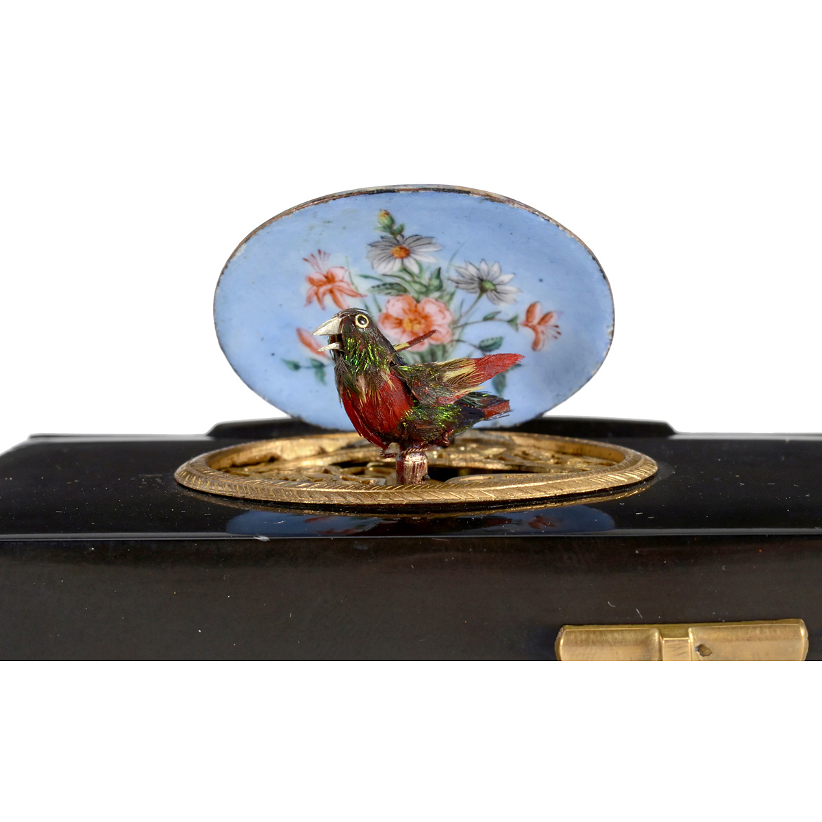 Probably Bontems. With going-barrel movement, bird with iridescent plumage, moving metal beak, perch, wings and tail, in composition or horn case with hinged key-compartment, enameled lid with interior depicting a floral arrangement on blue ground and exterior showing the study of a lady, possibly the actress Sarah Siddons (1755–1831), wd. 4 in. (10 cm), minor repair at side joint, working condition. With brass key, in silk-lined leather-covered fitted travelling case, wd. 4 ¾ in. (12 cm). – A visually appealing singing bird box with attractive enamel work.