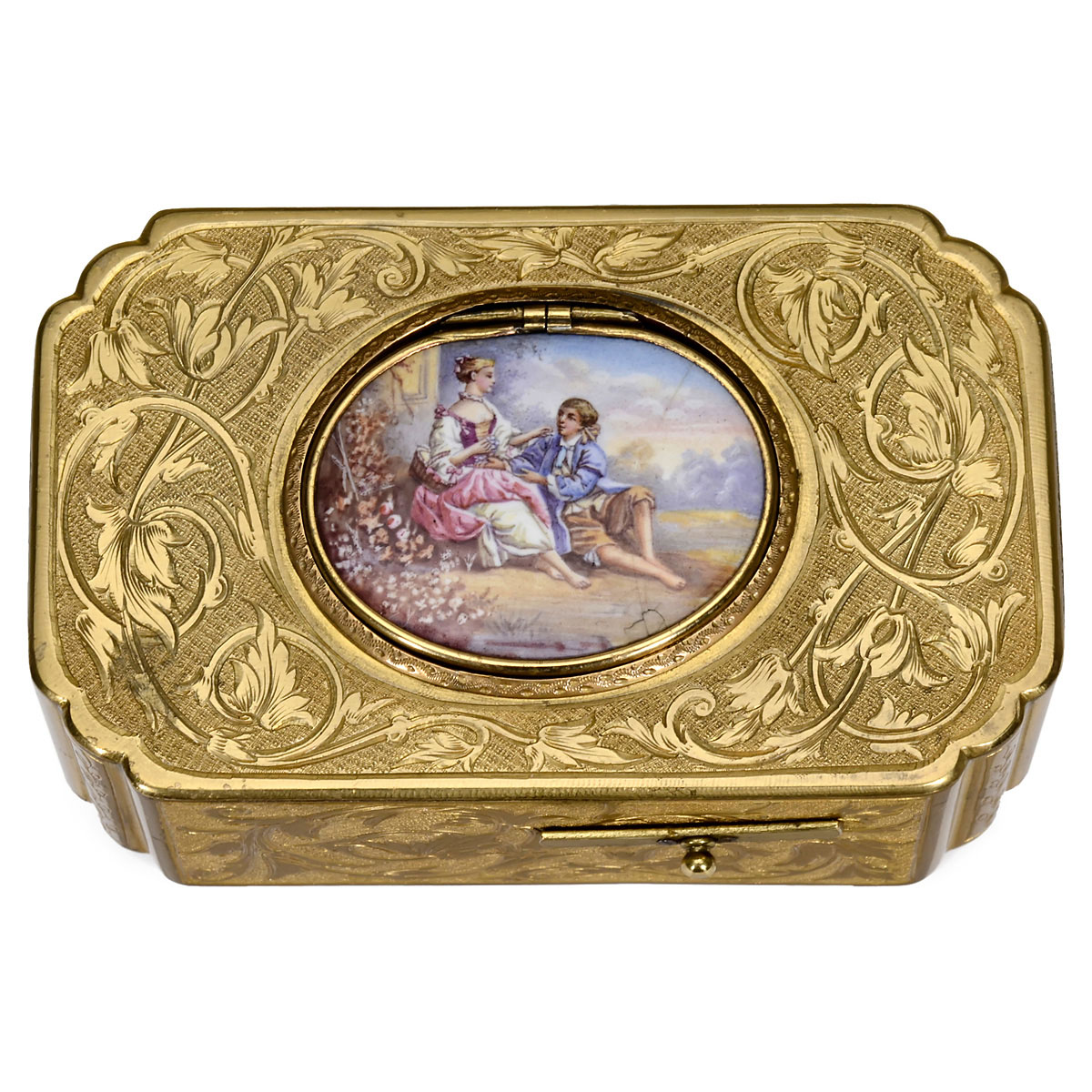London, with going-barrel movement, bird with iridescent plumage, bone beak, moving wings, perch and tail, in gilt-metal case with stepped and rounded corners, rear key-compartment, engraved foliate designs, enameled lid interior depicting a spray of flowers on blue ground and exterior a courting couple à la Watteau, wd. 3 ¾ in. (9,5 cm), tiny chip on edge of inner lid, tiny repair on edge of outer lid, good working condition. – An attractive singing bird box by a scarce English maker.