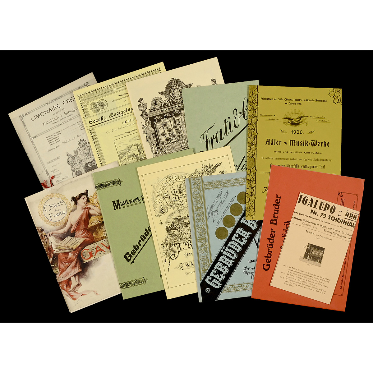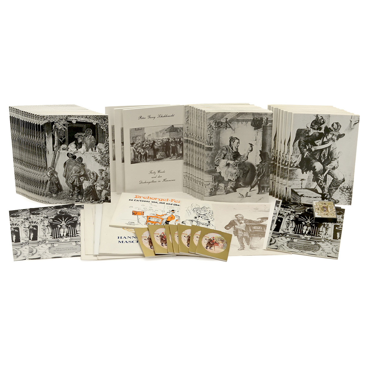 12 catalog reprints: Bacigalupo, Frati, Wellershaus, Gavioli, Bruder, Ruth and Adler; 35 issues "Musikhistorische Gesellschaft"; 70 postcards with barrel organs; 7 discs; 1 cassette "Dutch Street Organ" and other prints.