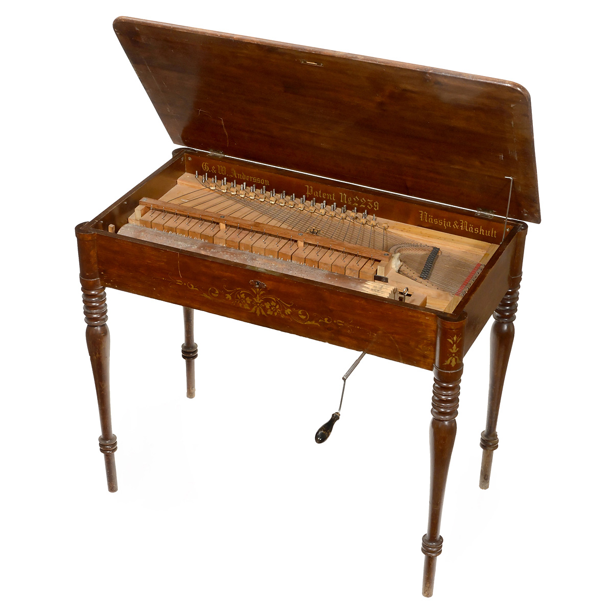 Signed: G. & W. Andersson, Nässja & Näshult, no. 48. Hand-cranked barrel-operated piano, 18 notes, 12-tune barrel approx. 25 in., size of case 19 ½ x 31 in., working condition but needs tuning.