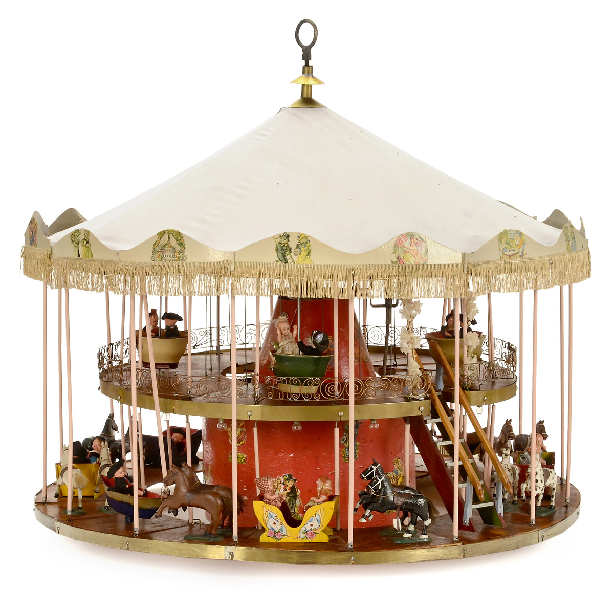 Wood, fabric and metal, 16 carved wood horses, 7 coaches and boats, stair to the second floor, 4 turnable gondolas, celluloid dolls, illuminated, electric motor drive, Ø 38 ½ in., height 35 ½ in., working.