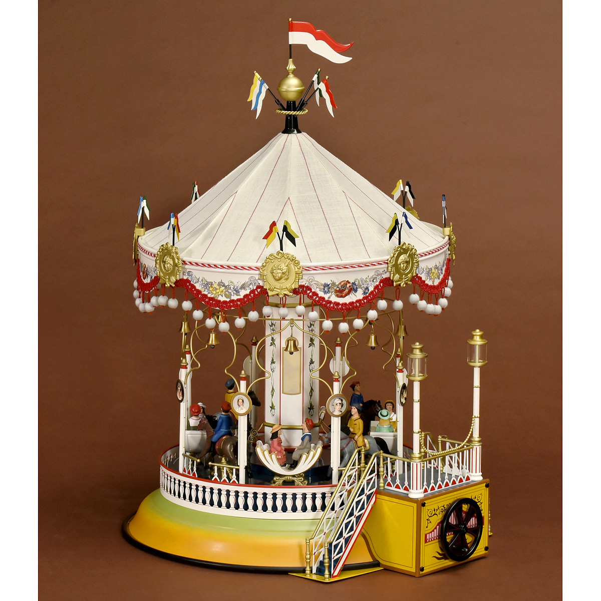 No. 16121, costly manufactured fairground carousel, remake of a 1920s Märklin no. 8847 model, mainly made of metal and cloth, 12 painted child's figures, handcrank-driven, with musical movement, overall height approx. 19 ½ in., with certificate in original box. With Wilesco steam engine no. D 409, electrically driven, with transformer, real steam drive possible. A fantastic working model.