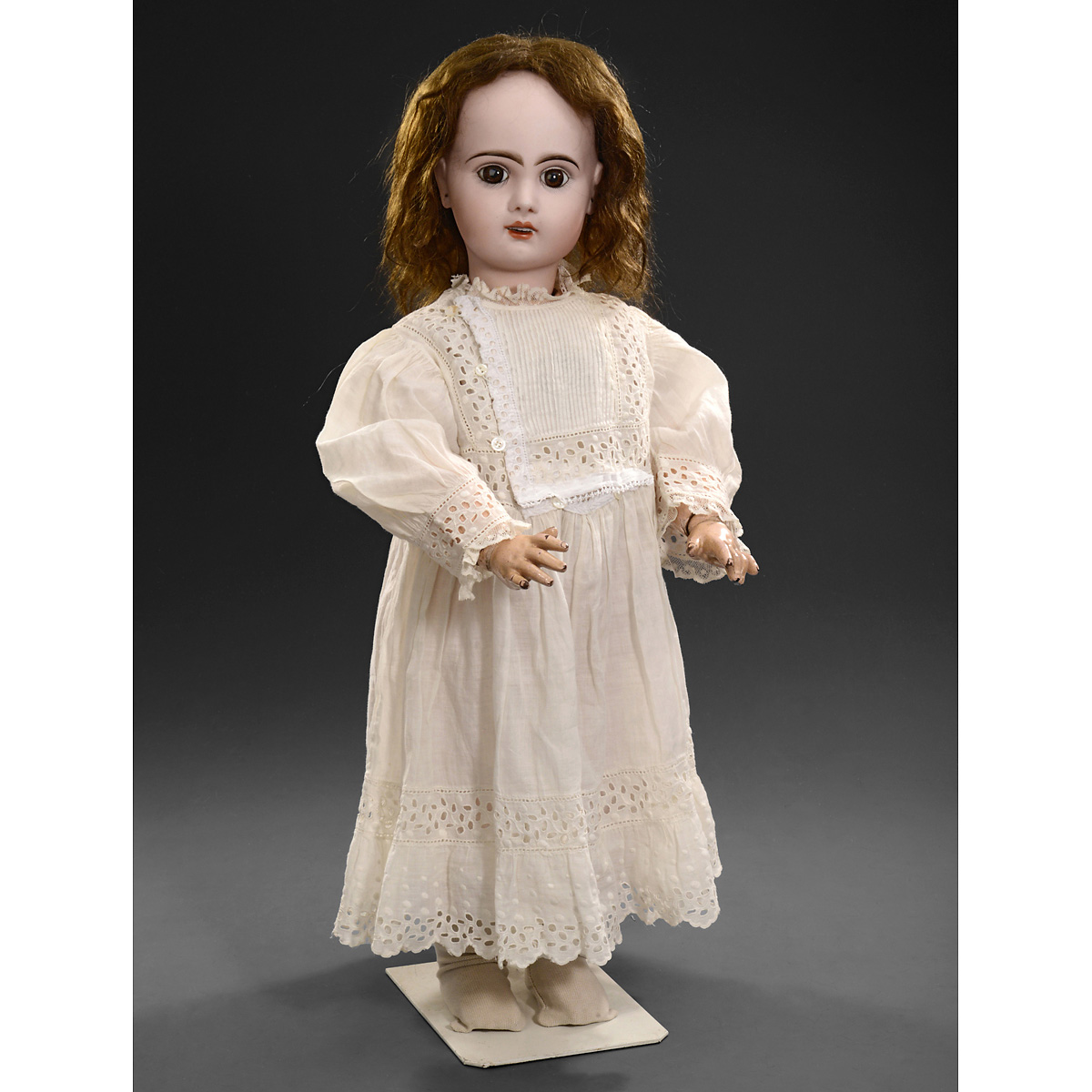 With bisque head impressed "11", fixed brown paperweight eyes, open mouth, upper teeth, pierced ears, brown mohair wig, jointed composition body with metal cover over chest, original finish and light "Bébé Jumeau, Diplome d'Honneur" ink stamp, dressed in contemporary muslin factory chemise and white-work dress with flap at chest for accessing the mechanism, height 24 in. (61 cm), visible mold seam on neck, some wear at wrist joints, otherwise good. Housed in the doll's chest is the brass key-wind Lioret phonographe No. 4979, with "H.L." stamp, floating mica reproducer and 2 ¼-inch (5,8 cm) celluloid cylinder ("Ah! Mon beau Château") with original paper label: "Phonographe Système Lioret". – It was Jumeau's request to Henri Lioret (then a clockmaker) to produce a speaking mechanism for dolls that inspired his first patents for a phonograph in 1893. Lightweight and elegant in design, Lioret's mechanism, however, proved too fragile and expensive for use in a toy. Though the speaking dolls were not a commercial success at the time (and are correspondingly rare today). The "Merveilleux" phonograph in its own right came into being in 1895. Later in his career Lioret worked on sound for films; he died in 1938 at the age of 90. – The mechanism of this example is in good working order and the sound of a laughing child, recorded more than 110 years ago, still plays clearly today! A rare example of an historic early phonograph in toy-form.