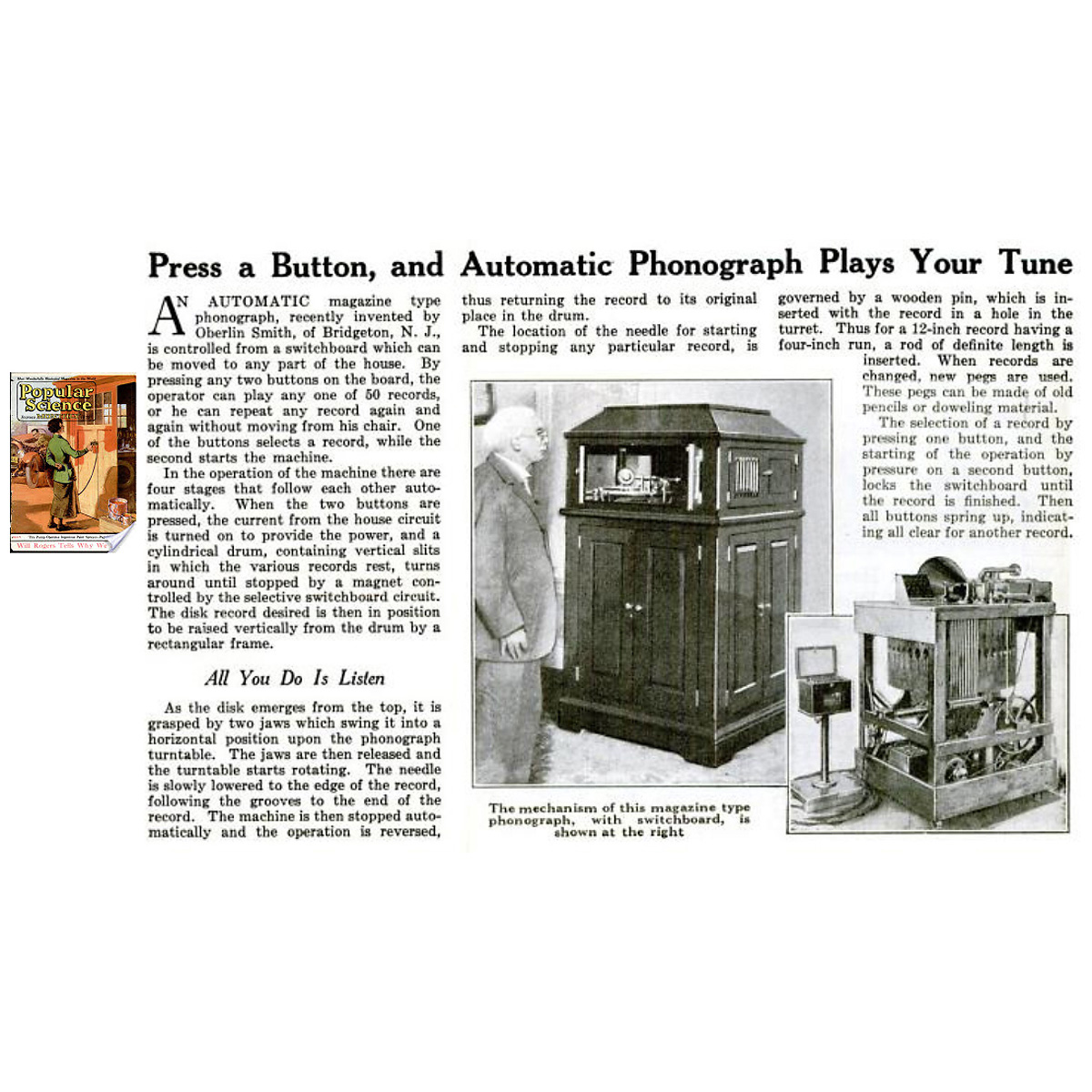 Oberlin Smith and the Genus of Magnetic Recording: Oberlin Smith was born in Cincinnati, Ohio, but spent most of his adult life in Bridgeport, New Jersey, where he established a business designing dies and presses. The Ferracute Machine Co., incorporated in 1877, built presses for hundreds of metal products from artillery shells to the first commercial oil cans, stamping out components for Packards, Winchester rifles and Kodak cameras. Through his work, Smith came into contact with inventors such as Thomas Edison and Alexander Graham Bell. – In 1877 Thomas Edison gave the first public demonstration of his tinfoil phonograph for recording and reproducing sound mechanically. Smith travelled to Edison's laboratory to see and hear the device in person. – Smith was disturbed by the scratching noises and by the limited length of the recording medium. Less than a year later, he filed two improvements to the phonograph and a provisional description of an electrical phonograph with the Cumberland County Clerk in a memorandum dated 23rd September 1878 and on 4th October 1878 filed a caveat at the United States Patent Office. – The first of improvement was to record phonograph signals on a long wire stored on reels, enabling extended pieces of music to be recorded. The second was to store the sound as a magnetic signal on a silk or cotton thread impregnated with metal powder. – According to Smith, his form of magnetic recording would produce "a perfect record of the sound, far more delicate that the indentations in the tin-foil of the mechanical phonograph". Smith continued to experiment with magnetic recordings over the next decade, publishing his ideas in an article titled "Some Possible Forms of Phonograph" in the influential "Electrical World" journal on 8th September 1888. – Despite Smith's prior work in the field, the Danish inventor Valdemar Poulsen (1869–1942) was credited as the first person to achieve magnetic sound recording with operational, mass-produced equipment. Poulsen filed a patent for a "method of recording and reproducing sound or signals" by "magnetically exciting paramagnetic bodies" on 8th July 1899. The patent was granted on 13 November 1900 and unveiled to the public with a recording of Kaiser Franz Joseph's voice at the Paris Exposition of the same year. – Poulsen certainly knew of Smith's work as the 1888 article from "Electrical World" was cited during the patent grant procedure, however Smith received no public credit from Poulsen. Smith reacted to Poulsen's omission by laying retrospective claim to the invention of magnetic recording in an application to U.S. Commissioner of Patents in Washington in November 1900. However, as he head filed only a caveat (and not a patent) in 1878, his claim was not taken seriously. – Not only did Smith's work raise the idea of a recording telephone, it also paved the way for developments in universal magnetic storage of sound, images and data still in use more than one hundred years later. Without Smith, much of today's magnetic recording technology – from the hard-drive to the magnetic strips of credit cards – would not have been possible. Smith's Last Invention: The Autofono – "All You Do is Listen …" Despite his disappointments in the field of magnetic recording, Smith did not give up his experiments with magnetic technology. On 29th December 1921, Smith filed a patent application for an "Automatic Phonograph". – "The main object of my invention is to reduce to the minimum the manual labor or effort required in the operation of phonographs and other instruments of entertainment ... Another object is to enable the application of the sound record ... by the manipulation of a controlling device, such as a keyboard, situated more or less remote from the instrument." – The patent was finally granted on 16th February 1926 and a second patent for an improved version, filed on 10 May 1924, was granted on 29th June 1926. Despite the lengthy application process, the "Autofono" had already been described and photographed with its inventor in the May 1923 edition of "Popular Science". – According to the article's author, the 'magazine-type phonograph' could be controlled by a portable switchboard from any part of the house. The operator simply selected any of the fifty records, changed it or repeated it, without having to move from his chair. Two buttons on the switchboard regulated four stages of operation: the current from the house circuit is turned on, the slotted drum is set in motion, the drum rotates until stopped by a magnet, the desired disc is then raised into position by a vertical frame, swung into a horizontal position and then lowered onto the turntable by a pair of jaws. The switchboard is then locked until the record has finished playing, after which the machine is stopped automatically and the operation reversed. – In the Autofono, Smith created the first fully automatic recordplayer, anticipating the first jukebox by some seven years. Sadly, once again, Oberlin Smith was to receive little credit for his invention. The death of the 86-year-old inventor in 1926 prevented the commercial application of his Autofono and a fire at his home in 1934 destroyed what is believed to be the only other surviving example. – The Autofono on offer here is in unrestored, original non-functioning condition. The boxy flat-topped machine seen here is definitely the first model (of 1921); the second model from 1924 had slimmer proportions and a rounded top. – A fantastic restoration project and historically important museum exhibit! References: 1) Jean Jones, "The Story of Oberlin Smith", The News, 24th June 2006, pp. A6–7. – 2) "Oberlin Smith and the Invention of Magnetic Recording", Philadelphia Enquirer, 29 December 1988. – 3) Auction Team Breker, 16 November 2013, Lot 56, for information on Poulsen's "Telegraphone". – 4) Popular Science, May 1923, p. 47. – 5) Friedrich Karl Engel (ed.) "Oberlin Smi