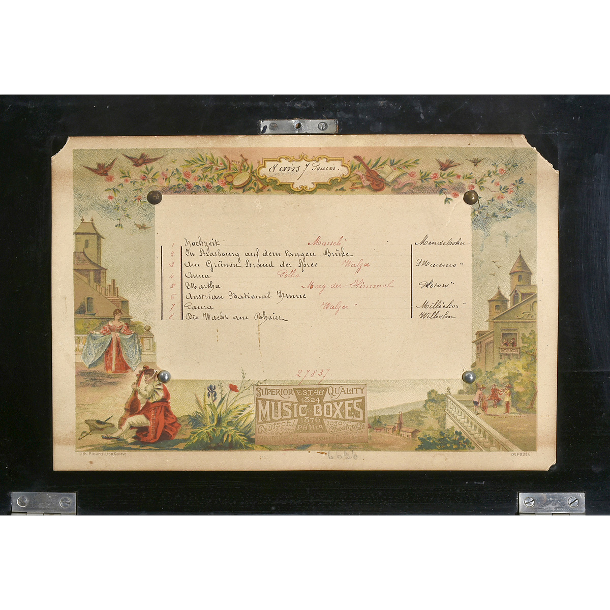 No. 27837, playing eight popular airs and national anthems including "Wedding March" by Mendelssohn, "Austrian National Hymn" and "Die Wacht am Rhein" (Gamme No. 6626), with 57 teeth in comb (complete), zither attachment, nickel-plated cylinder, tune-indicator and tune-sheet with retailer's label: "Gautschi & Sons, 1030 Chestnut St., Philadelphia. Superior Quality Music Boxes. Estab. 1824, 1876. Send Stamp for Catalogue", in grained case with original finish and inlaid rosewood-veneered lid, width 18 in. (46 cm), cylinder 8 in. (20 cm), finish on lid scuffed, slight damper noise, movement in overall good restored playing condition. A small musical box with a great deal of volume.