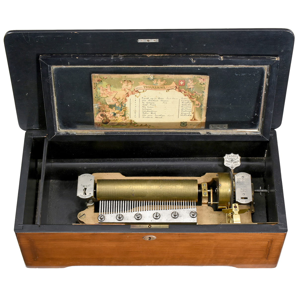 No. 66005, playing ten mainly dance airs including "Faust up to Date, Skirt Dance" by Lutz and "Darkie's Dream" by Lansing, with 42 teeth in comb (complete), crank-wind motor, Jacot's safety check, patent dates to 1888, tune-sheet and walnut case with veneered lid (small losses), width 19 ½ in. (50 cm), cylinder 7 ½ in. (19 cm), no crank, good playing condition.