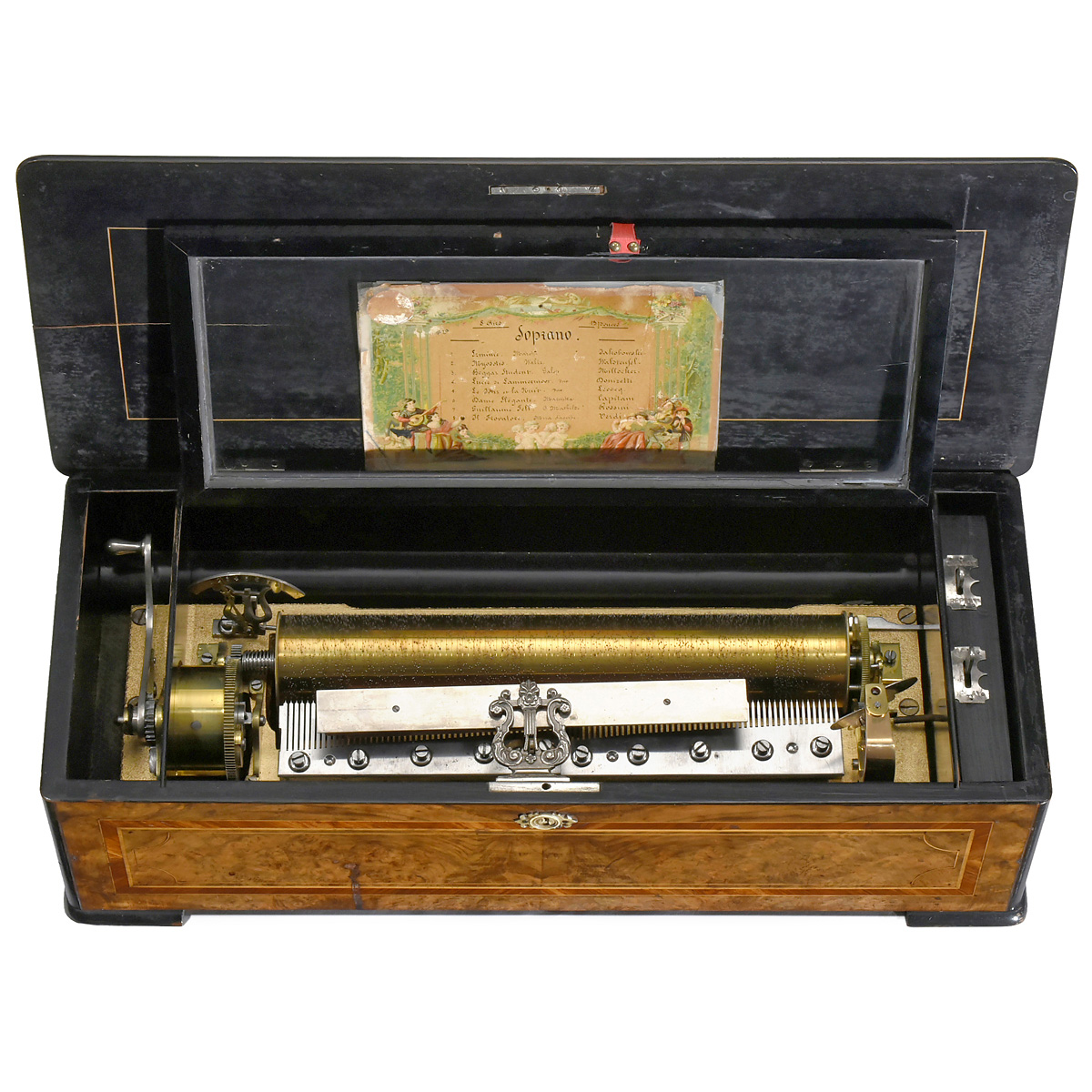 No. 18994, playing eight dance and operatic airs (Gamme No. 20), with 100 teeth in twin combs (complete), zither attachment, tune-indicator and (damaged) tune-sheet with retailer's sticker: "F.C. Schottin, Bookbinder, Stationer, Importer of Musical Articles, 62 East Hupor Street, Buffalo, N.Y.", in book-matched walnut-veneered case with original finish and geometric inlay of brass, ebony and mother-of-pearl on the lid, width 24 in. (62,5 cm), cylinder 14 in. (36 cm), split in lid, three nicely replaced treble teeth in right-hand comb. A well-arranged musical box with full tone and volume, in good restored playing condition.