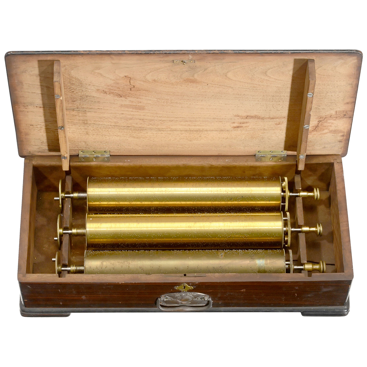 No. 25094, with large selection of four-air cylinders, a total of 122 teeth in two combs (complete), massive double-spring motors, butterfly-wing governor, plaque with patent dates 1874 (England) and 1875 (America), tune-sheet and book-matched thuya-veneered case with original finish, width 37 ½ in. (95 cm), cylinders 13 in. (33 cm), lid split, movement in good restored playing condition. With 8 cylinders, in original storage cases. A fine musical box with an extensive program!