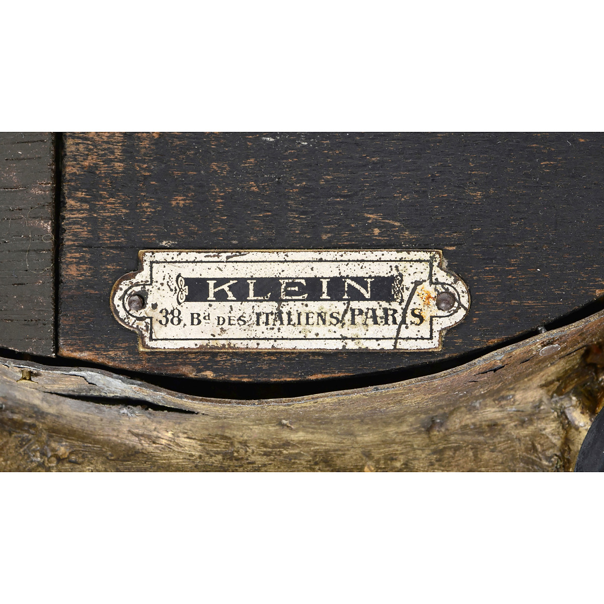 France, modeled as a girl selling flowers while a moving butterfly perches on her tray, the articulating wires concealed in tall lily leaves, on serpentine base with two inkwells whose hinged lids activate the cylinder musical movement, playing two short airs as the butterfly flutters its wings, the underside with plaque: "Klein, 38 Bd. des Italiens, Paris", ht. 7 ¼ in. (18.5 cm) x wd. 7 ½ in. (19 cm). An unusual and elegant musical desk ornament.