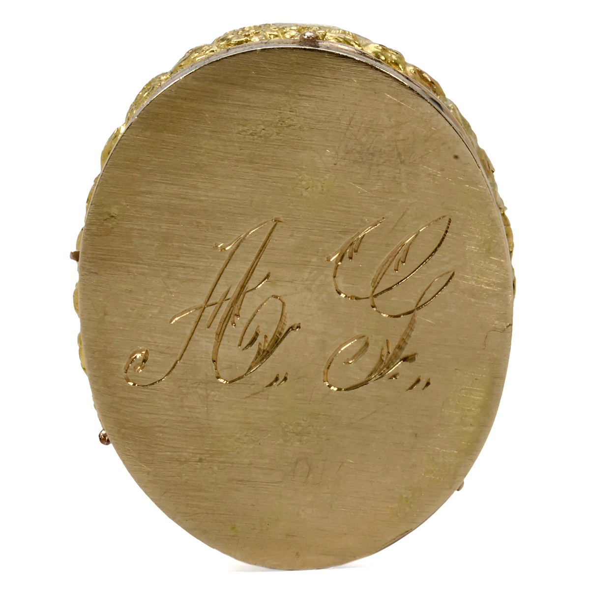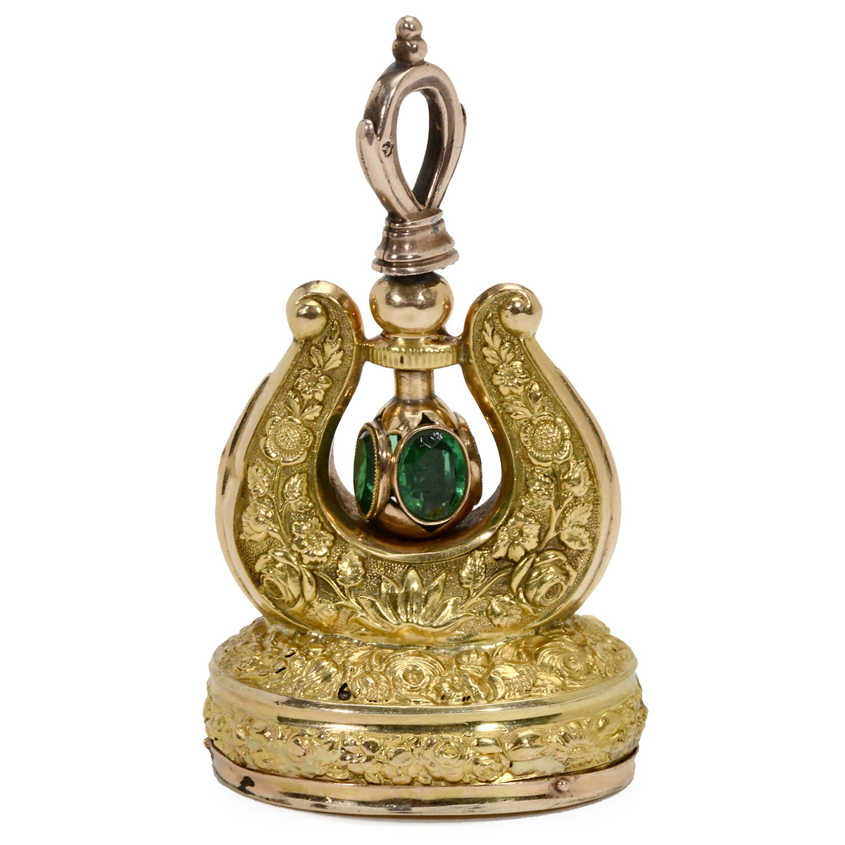 Probably France, with single-air barillet musical movement wound clockwise through suspension loop, Empire-style lyre-form case decorated with repoussé wild flower motifs on stippled ground, stem with faceted emerald-colored glass and underside with engraved monogram "A.G.", ht. 2 1/8 in. (5,2 cm) x wd. of base 1 1/5 in. (2,8 cm), small split on lower border. – A fine early piece of musical jewelry.