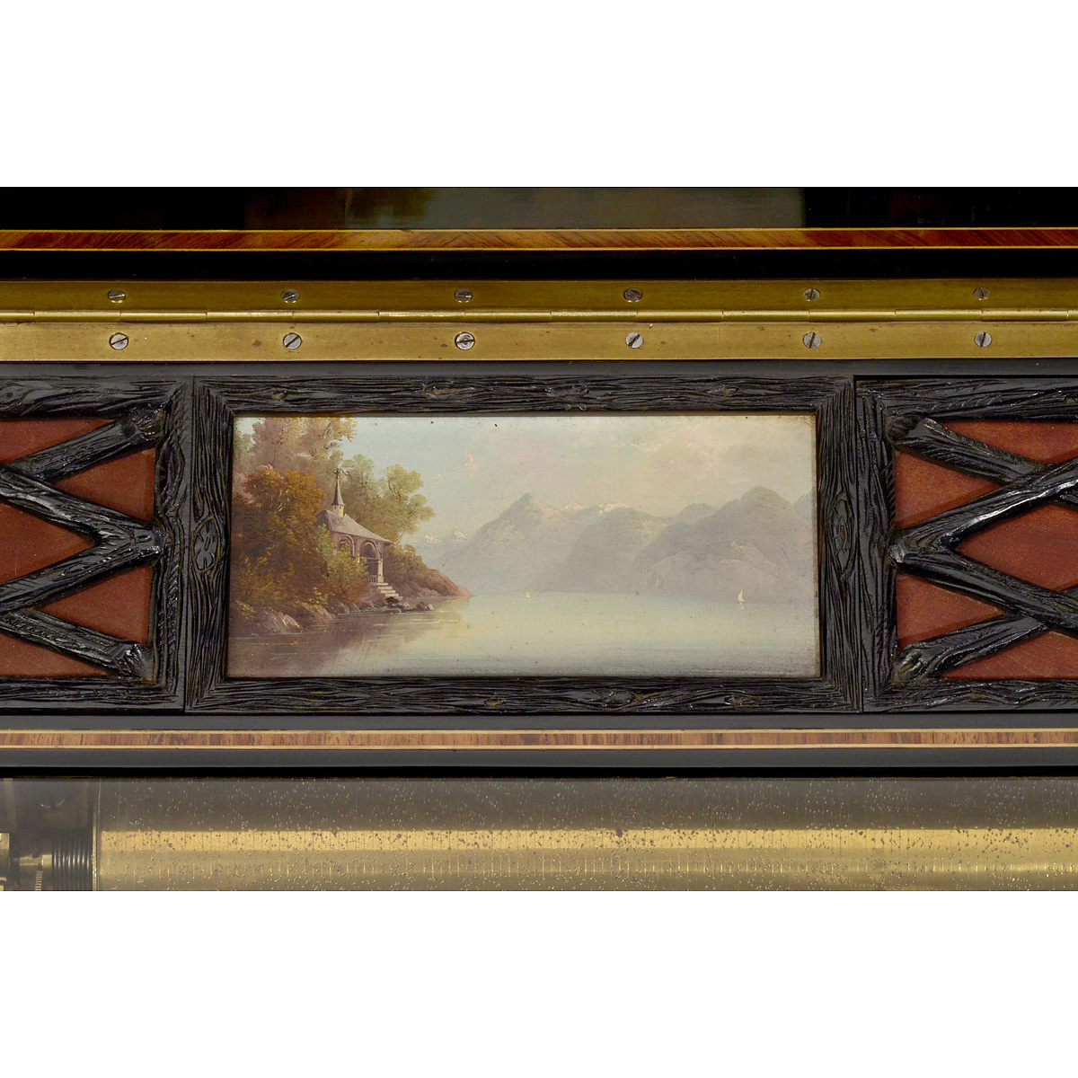 No. 16491 and "B" with single "fat" cylinder playing six airs identified by a former owner as "Barber", "La Traviata", "Les Huguenots", "Fra Diavolo", "Semiramis", and "Oberon", comb of 135 teeth (complete) and mandolin groups of up to 5, substantial brass movement with knurled screws for locking cylinder-changing mechanism, burr-walnut veneered case with kingwood banding, carrying handles, two-part inner lid with rustic carved sound fret and miniature oil painting on the upper side and gilt-tooled leather surface on the underside, width 33 ½ in. (85 cm), cylinder: 14 in. (36 cm) x 3 1/8 in. (8 cm) diameter. Overall good playing condition, 16 unobtrusively replaced teeth, some dampers need adjustment. An impressive interchangeable overture musical box!