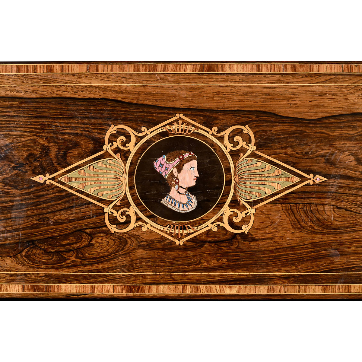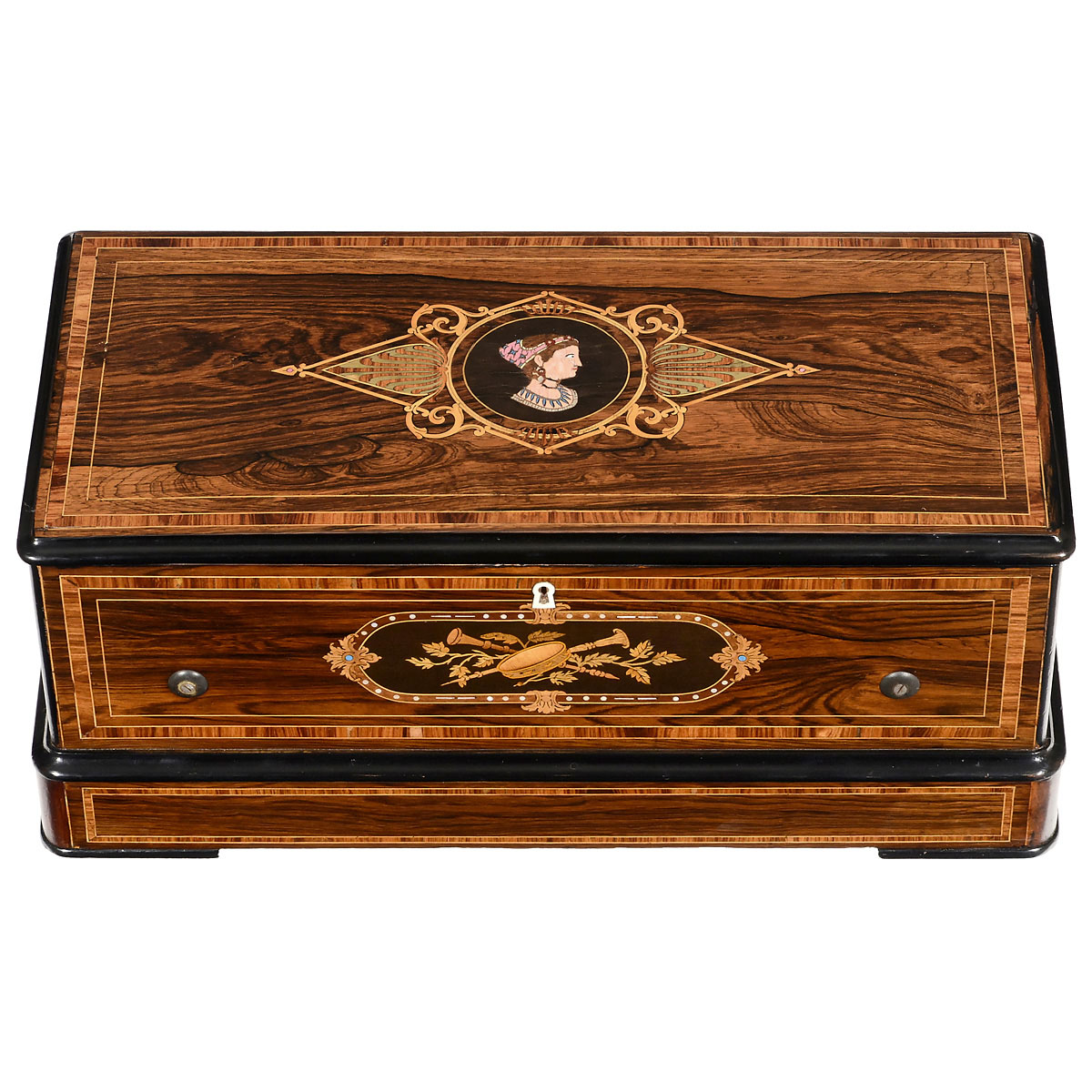 No. 10494, playing twelve operatic airs on six revolutions of the 'fat' cylinder, with 123 teeth in comb (complete), governor stamped "BAB", comb stamped (indistinctly) "SW", tune-sheet and rosewood-veneered case with inlaid musical trophies on the front and inlaid enamel portrait of an Etruscan woman in profile on the lid, width 24 ¾ in. (63 cm), cylinder 13 x 3 3/8 in. (33 x 8,5 cm), comb with approx. 53 replacement tips and 2 replacement teeth, some dampers in need of adjustment. Despite comb repairs an attractive musical box with impressive proportions and a most unusual case design.