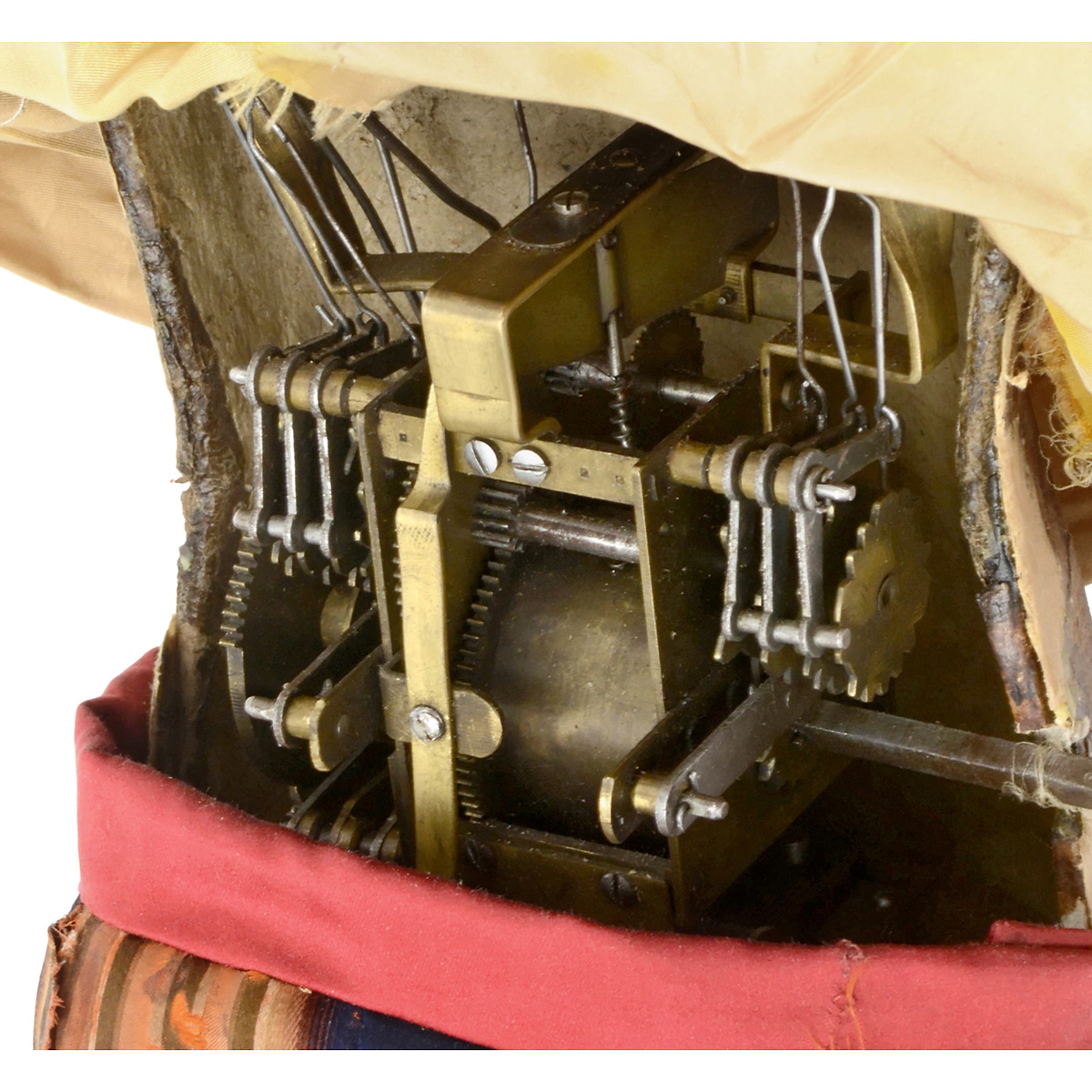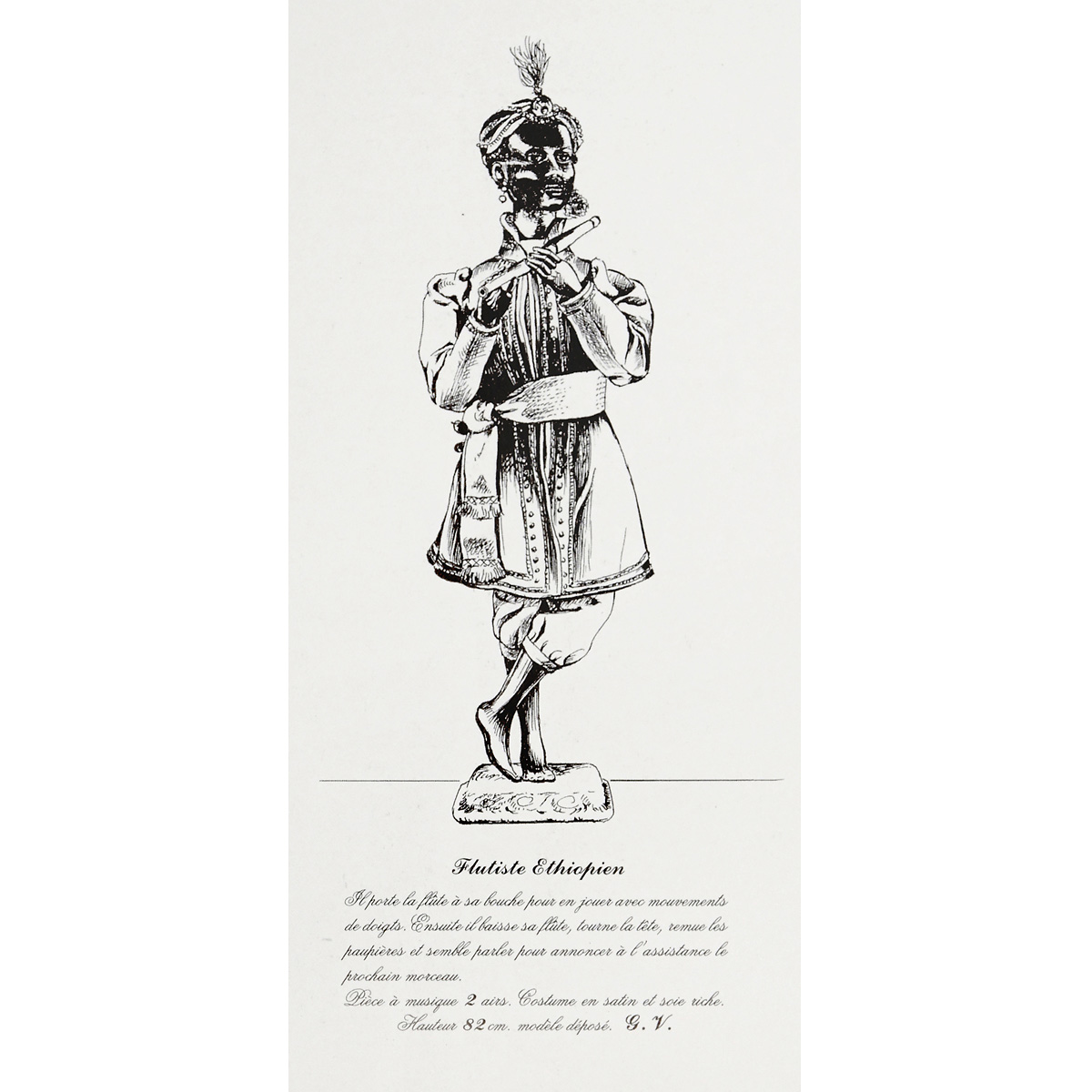 With leather-covered papier-mâché head, brown glass eyes with articulated eyelids, articulated mouth with carved bone teeth and tongue, lamb's wool wig, gutta-percha hands with moving fingers holding turned maple flute, going-barrel motor with intermittent three-air cylinder musical movement in the body, standing with one leg crossed over the other on velvet-covered base, in striped silk breeches, cream silk shirt and red satin tailcoat with striped lapels and cuffs, ht. 31 in. (79 cm), good working condition. With steel key stamped "G.V." and brass acorn-form stop/start. – Movements: The intermittent cylinder musical movement, timed to accompany the figure's actions, is a rare feature found on only a handful of automata by Vichy. As the automaton raises the flute to his lips, the music begins, his eyelids flutter and his fingers play lightly over the stops. After a complete tune is played, he lowers his flute and the music pauses. He looks up, moves his mouth as though announcing the next title, raises the flute and the sequence recommences with his second tune. – Background: Scientifically classified in 1843, gutta-percha is a natural thermoplastic material produced from the sap of the Isonandra Gutta tree native to the Malay Peninsula. The sap was heat-treated and formed into gutta-percha bricks for export, which the eventual manufacturer would soften in hot water and mould to a high-definition and then paint, polish or even gild. The material was used in products as diverse as mourning jewelry, golf balls, musical snuff box cases and even underwater telegraph cables. – Gutta-percha was used in the toy industry by Adelaide Huret and Leverd et Cie as a material for doll bodies and by Gustave Vichy for the articulated fingers of his more elaborate automata. The material was malleable enough for detailed modelling of the finger lines and nails and sufficiently lightweight, and yet still strong, for the playful movements of the fingers over the stops. – Literature: Illustrated in Bailly, "Automata, the Golden Age, 1848–1914", p. 238; Michael Canadas, "La Gutta Percha". – An elegant Vichy automaton, companion piece to Vichy's "Ethiopian Harpist", Lot 572 in this auction.