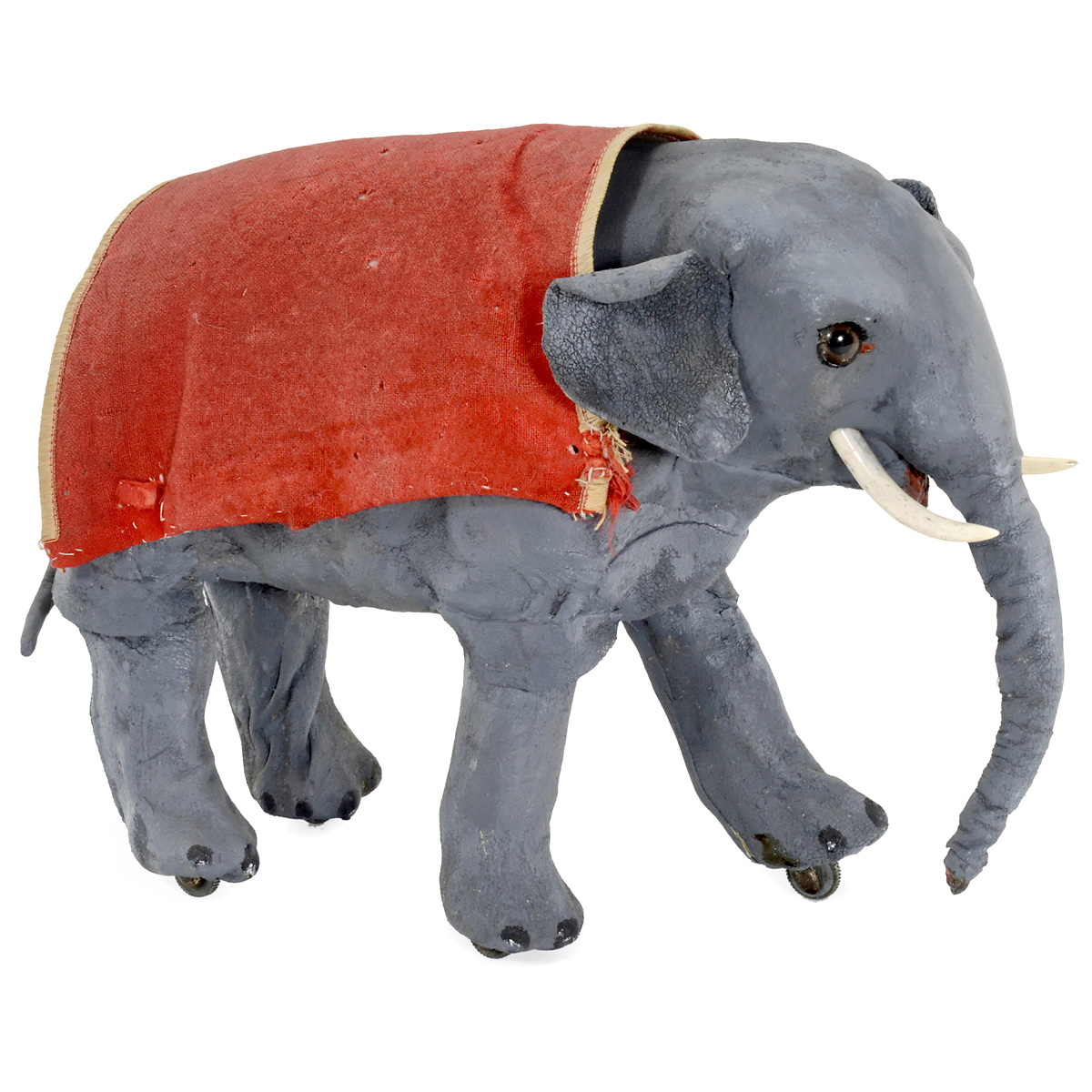 With painted leather-covered papier-mâché body, carved bone tusks, glass eyes, red wool blanket, articulated legs (with serrated wheels under the feet) and trunk, stop/start lever and open-spring motor in the body that causes the elephant to walk forwards while curling and uncurling his trunk realistically, ht. 7 ½ in. (19 cm) x lg. 11 in. (28 cm). – An automaton elephant first modeled and produced under Jean Roullet – compare to lot 587 by Gaston Decamps in this auction.