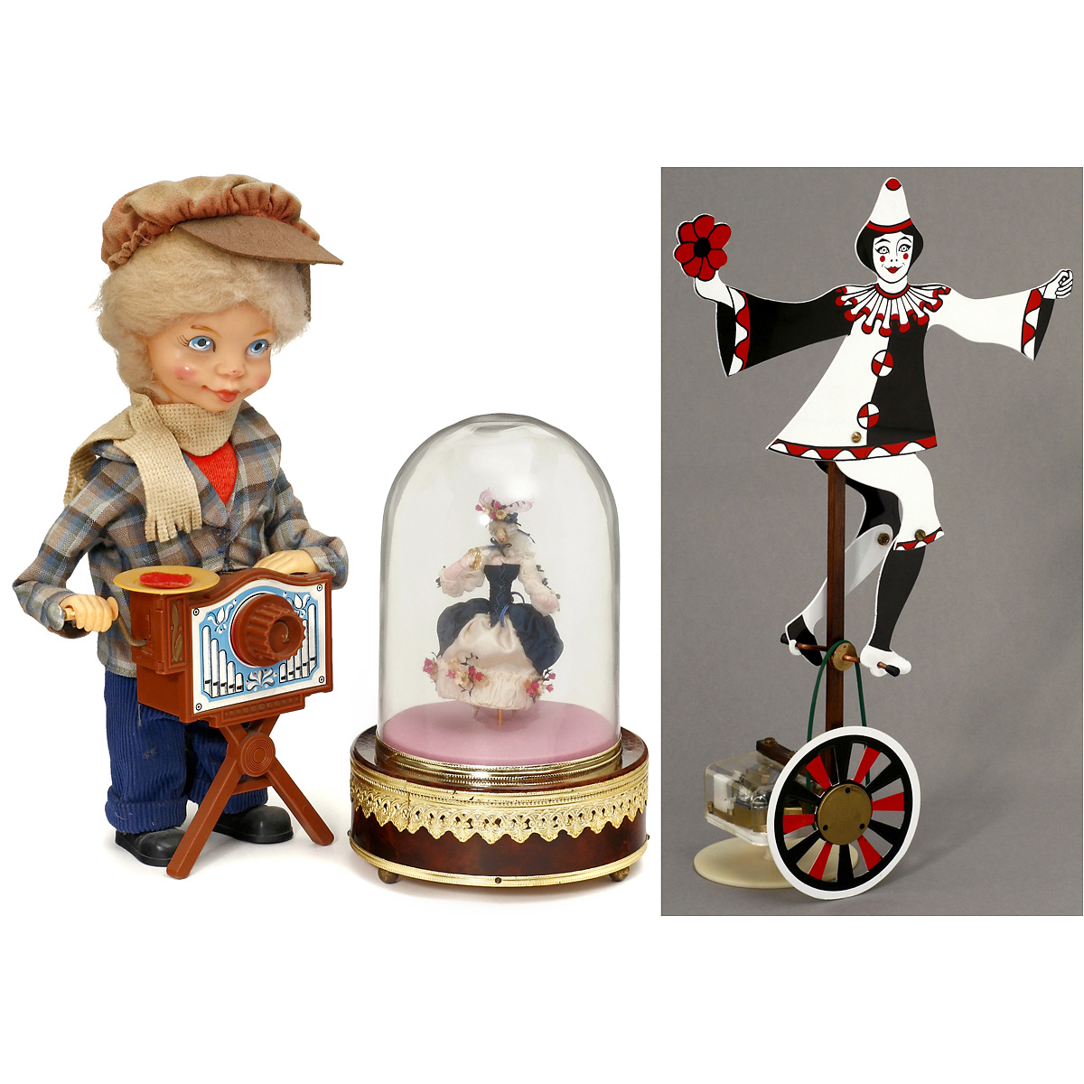 1) Musical pierrot, Switzerland, playing "Entrance of the Gladiators", height 14 ¼ in. – 2) Reuge, Switzerland, "Dancing Rococo Lady", 2-air movement, glass dome. – And: 3) Barrel organ grinder by "Carl", plastic and fabric, height 11 ¾ in.