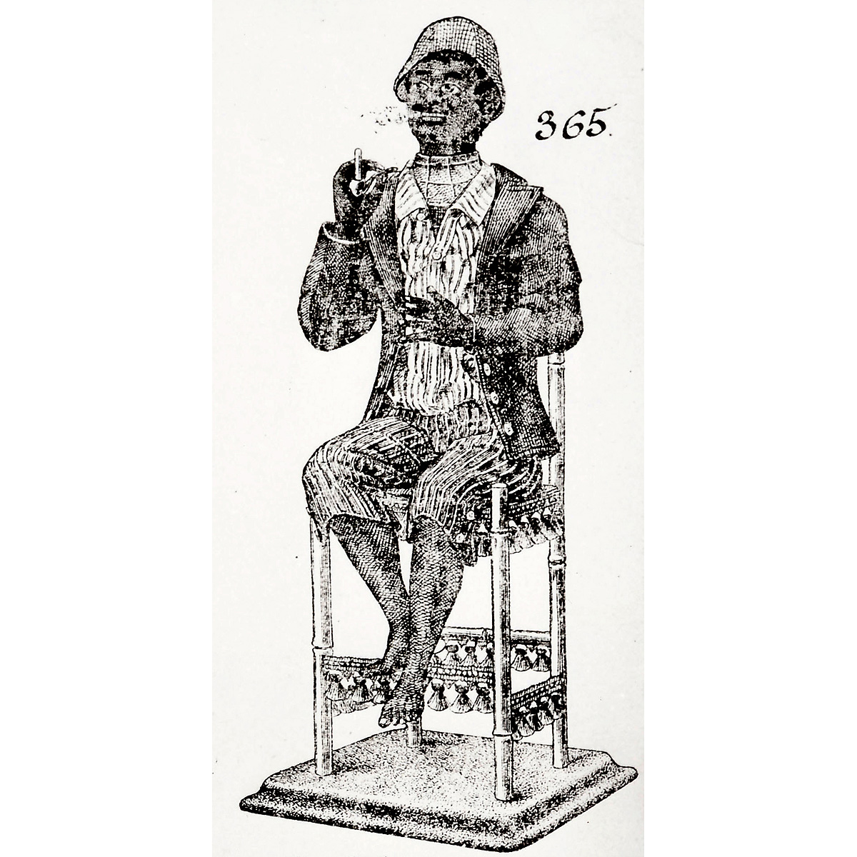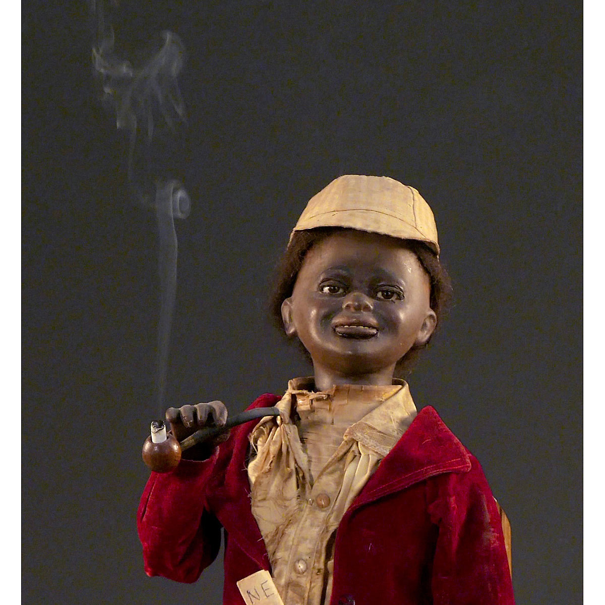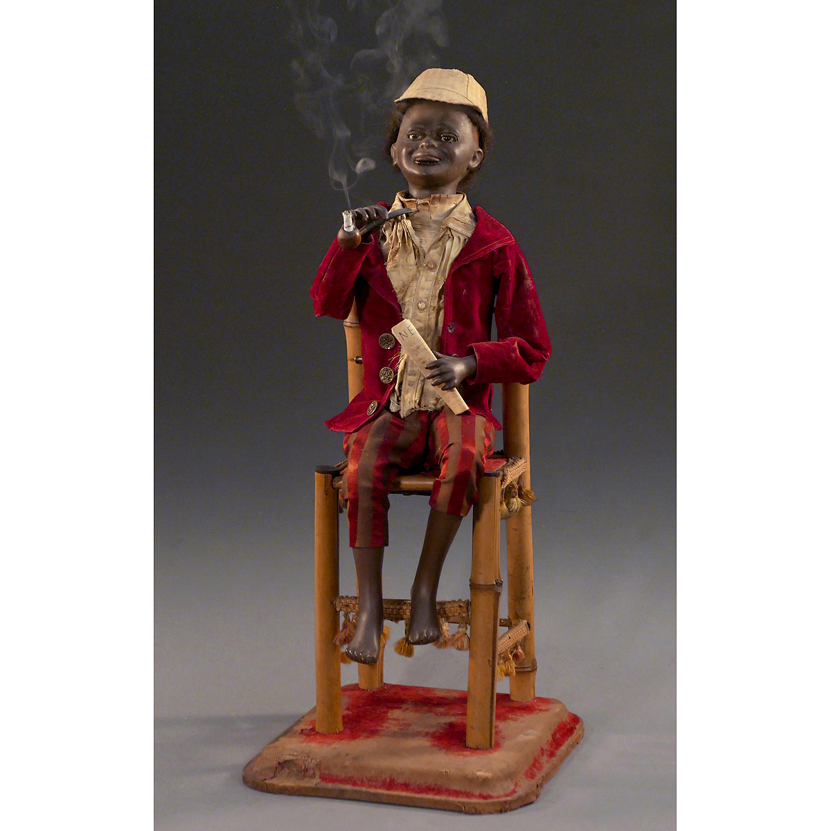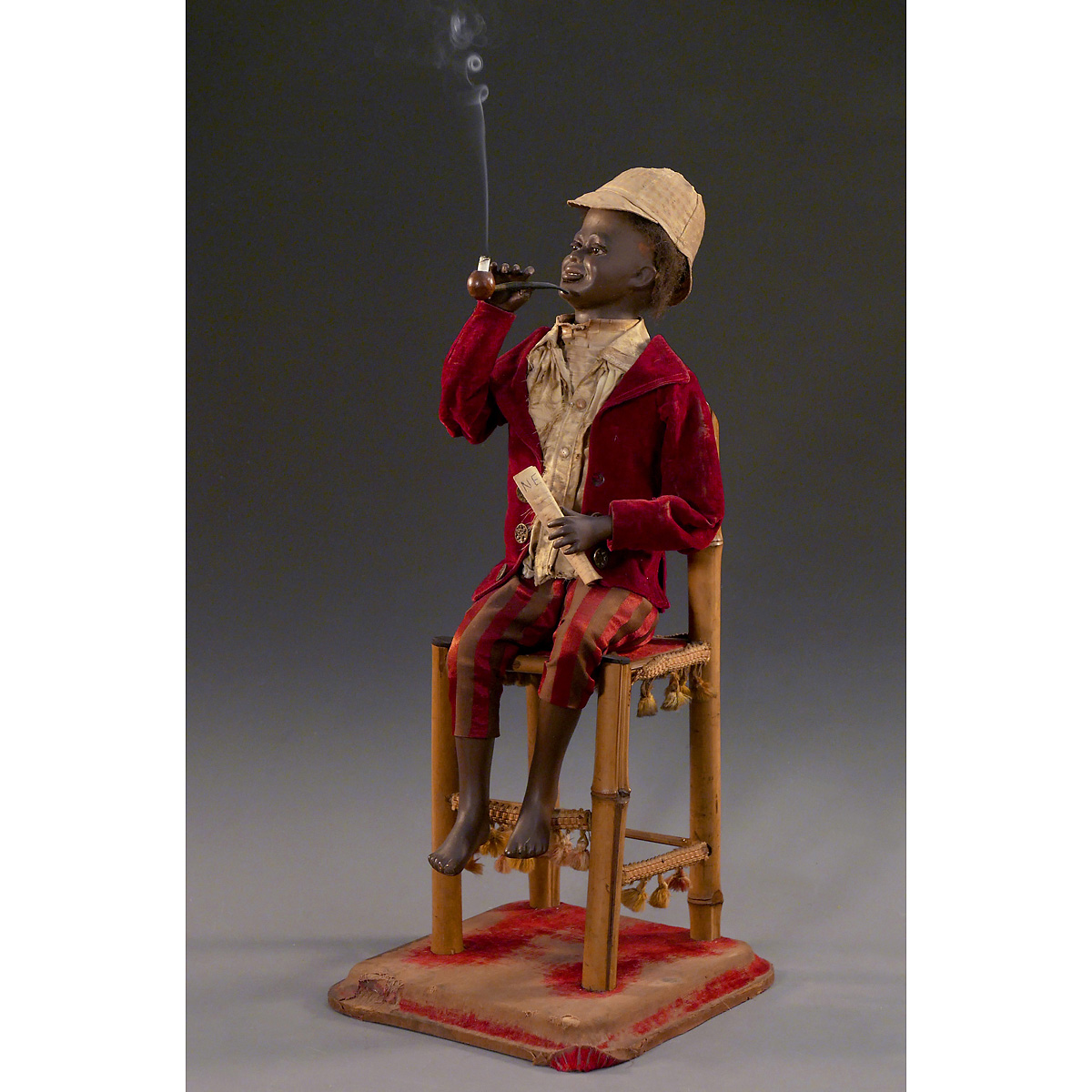 With plaster-composition head, original paint (some minor retouch), black hair wig, brown eyes with articulated lids and articulated lower jaw with painted teeth, sitting barefoot on bamboo chair, his torso containing bellows and single-air going-barrel movement that causes the boy to turn and nod his head, blink and raise the pipe to inhale while waving a newspaper with his left hand, the smoke drawn through the right arm and emitted from the mouth as he moves his lips to exhale, in original velvet jacket, silk shirt and checked silk cap, ht. 24 in. (61 cm). With steel size 10 key. A smoking automaton with expressively modeled character head, in working condition. – Literature: Bailly, "Automata, The Golden Age", p. 321.