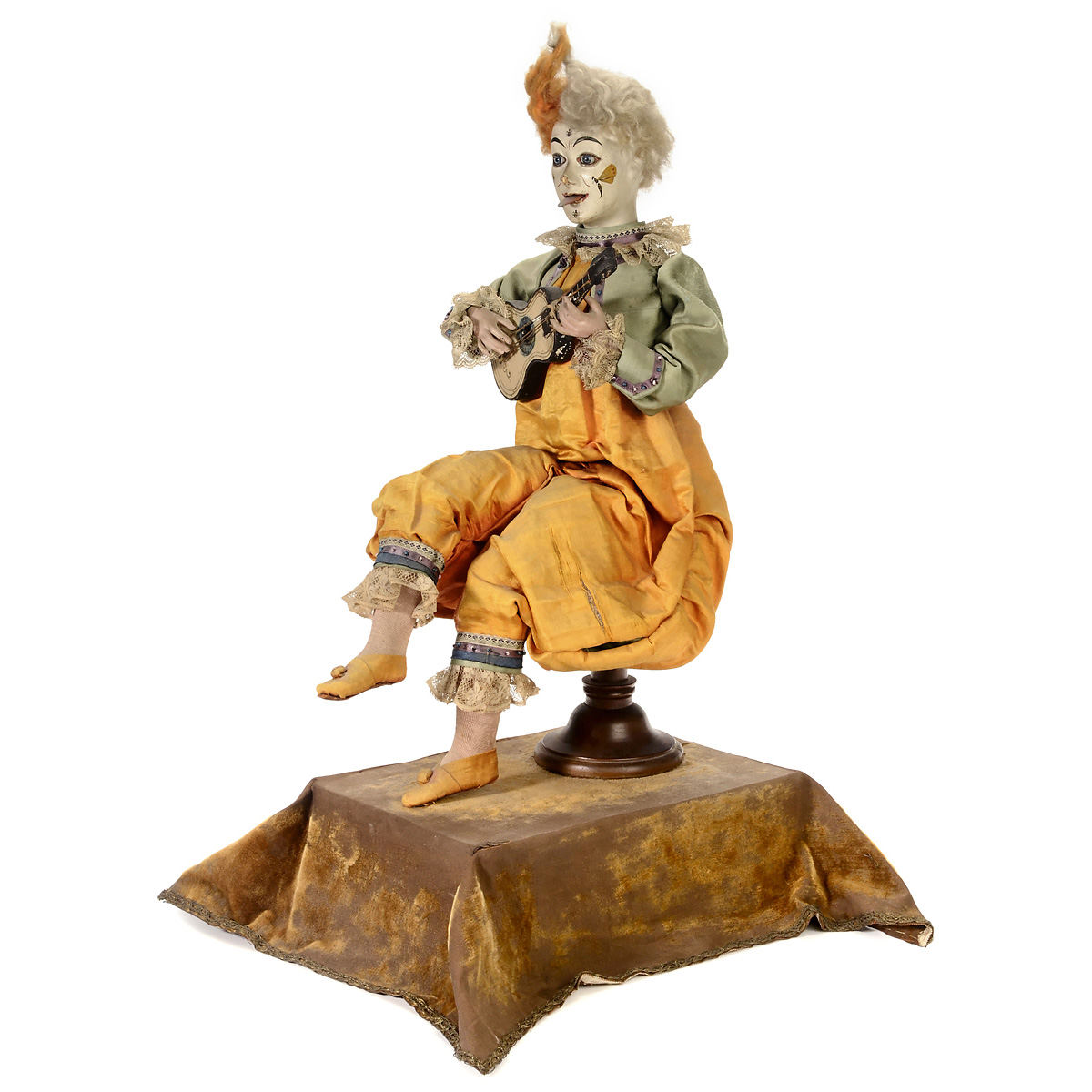 Modeled as an elegant clown seated upon a turned wood stool, with papier-mâché head decorated with dragonflies and beetles, original paint, fixed blue paperweight eyes, two-color mohair topknot, bisque hands holding painted wood guitar, on velvet-covered base with open-spring movement driving four cams and a (later) two-airs-per-turn musical movement of the correct type, dressed in gold satin costume and green silk jacket trimmed with lace and beads, ht. 22 in. (56 cm). With steel key monogrammed "LB". – The clown musician strums with his right hand while raising the neck of the instrument in his left, leaning back and forth on his stool, crossing one leg and then lifting both together as he bends his head in concentration, looks to the left and right as though surveying his audience and then saucily sticks out his tongue! – Literature: Bailly, "Automata, the Golden Age", pp. 181, 351; Auction Team Breker, 26 May 2012, Lot 716 for a similar piece. – A very handsome example of a classic Lambert automaton with complex series of motions, in good working condition.
