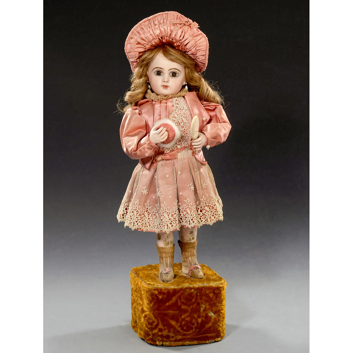 With Jumeau bisque head, stamped "Déposé Tête Jumeau, Bte. S.G.D.G. 4", closed mouth, fixed brown paperweight eyes, pierced ears with earrings, dark-blonde hair wig on cork pate and bisque hands holding a powder puff and a mirror, on velvet-covered base with going-barrel movement playing a single air ("Les Yeux Bleus Valse" – "The Blue Eyes Waltz") as the figure lifts the puff to her face, nods to the left, turns her head and then raises the mirror to admire her reflection, dressed in asymmetrical satin jacket, lace-trimmed skirt and matching bonnet, ht. 20 in. (50 cm), one finger repaired, minute ear-piercing chips, working condition. With tune-sheet and lacquered brass key. – A classic Lambert automaton featuring a particularly beautiful bisque head by Jumeau.