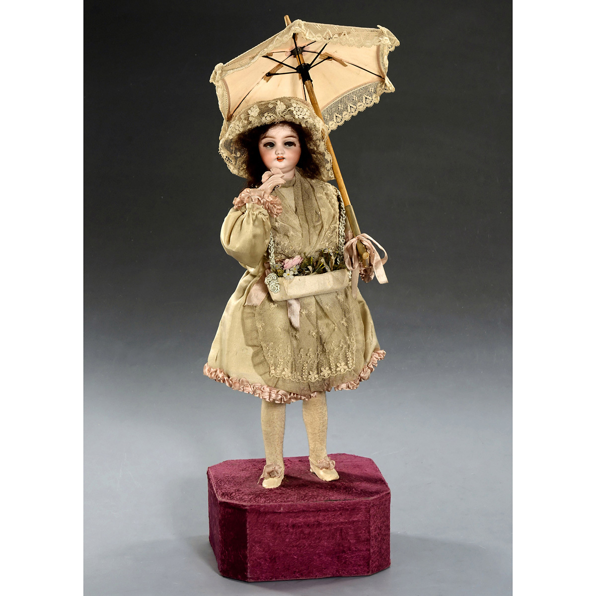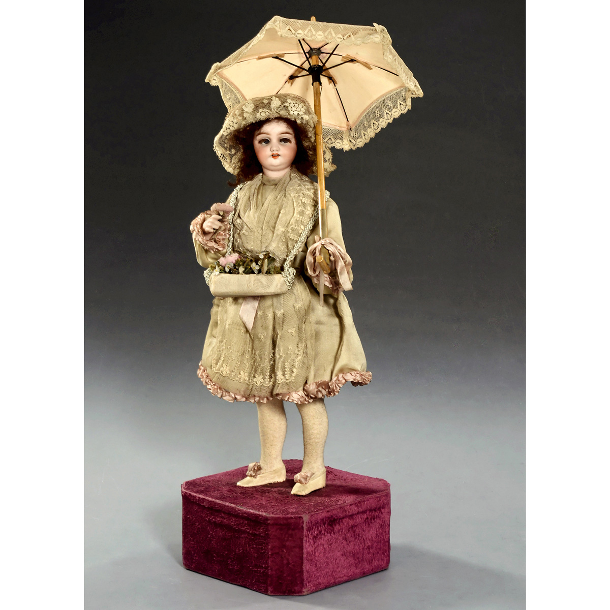 With Simon & Halbig bisque head marked "SH 1039, DEP 3 ½, Germany", open mouth, flirty blue glass eyes with lashes, original mohair wig, bisque hands holding a rose and a parasol, a silk-covered basket of flowers suspended at her waist, on velvet-covered base containing going-barrel movement playing a single air as the flower seller looks from side to side, raises the rose to her face and adjusts her parasol. In original cream silk costume with ruffled pink edging, lace apron and matching hat, ht. 23 in. (58 cm) including parasol, light hairline crack on forehead – covered by wig, some splits in silk skirt. With key. – A charming and seldom-seen automaton with unusual movements, in working condition. – Literature: Bailly, "Automata, the Golden Age", p. 304, for catalog illustration.