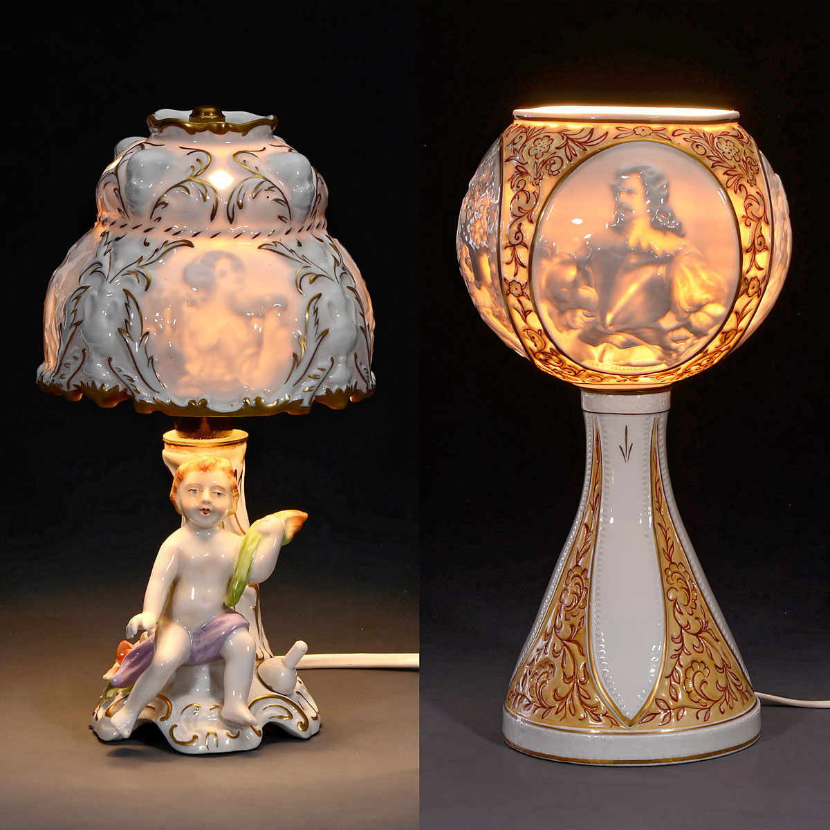 Manufactured by PMP – Porzellanmanufaktur Plauen. Hand-painted. 1) Baroque-style figural lamp, shade and stand marked "Made in GDR", height 9 ½ in., c. 1960. – And: 2) Table lamp, stand marked, height 14 ½ in., c. 1930